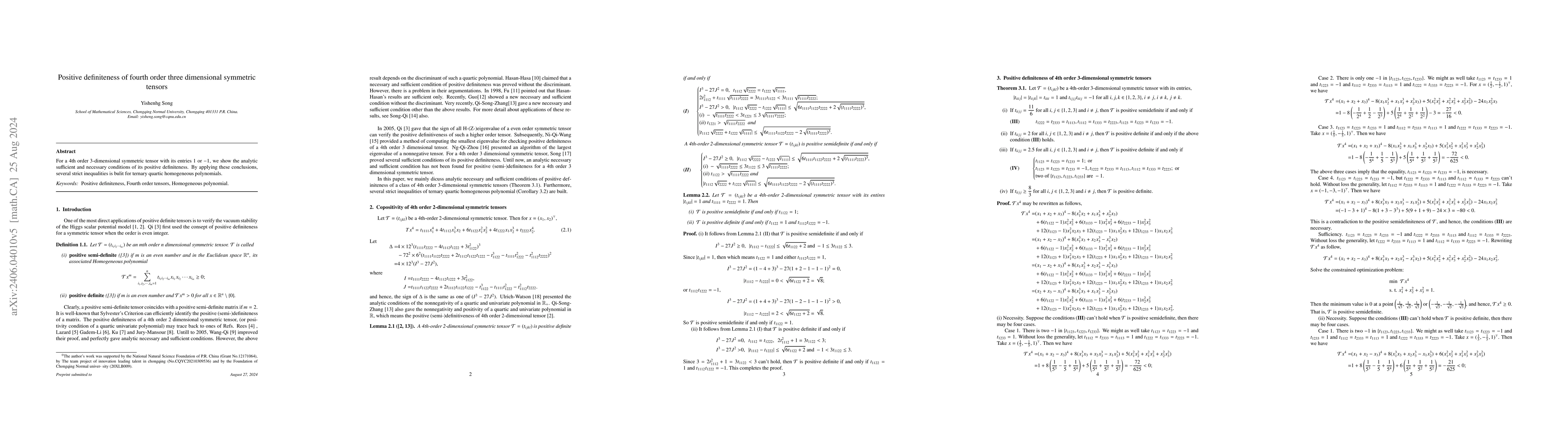 Summary: This paper establishes analytic conditions for the positive definiteness of fourth-order, three-dimensional symmetric tensors with entries of 1 or -1, and derives several strict inequalities for ternary quartic homogeneous polynomials based on these conditions.