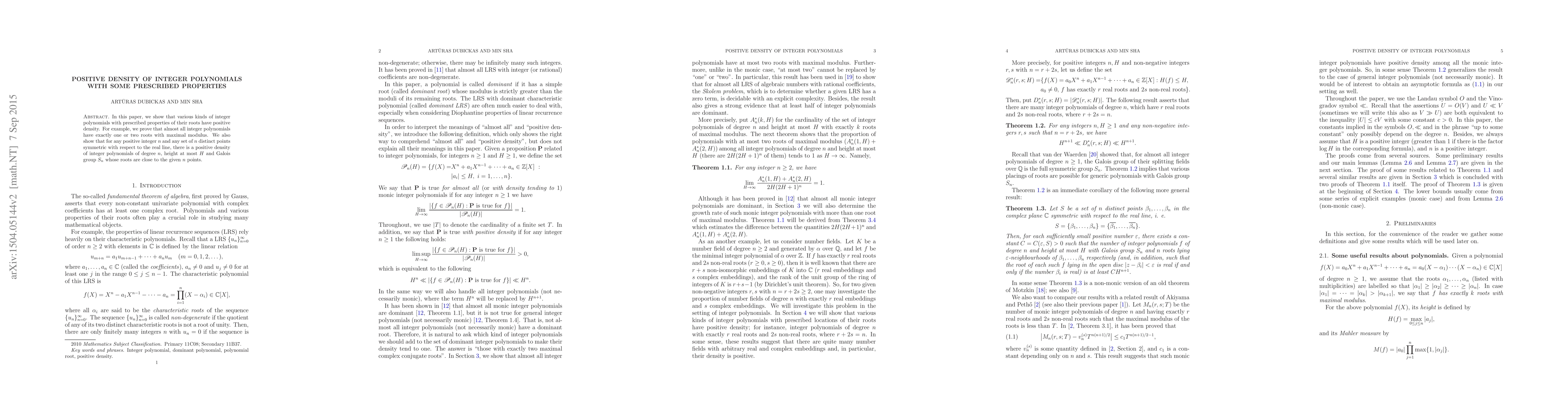 The paper employs techniques from analytic number theory, particularly focusing on the distribution of roots of polynomials with integer coefficients, and utilizes probabilistic Galois theory to estimate the density of such polynomials with specified root properties.