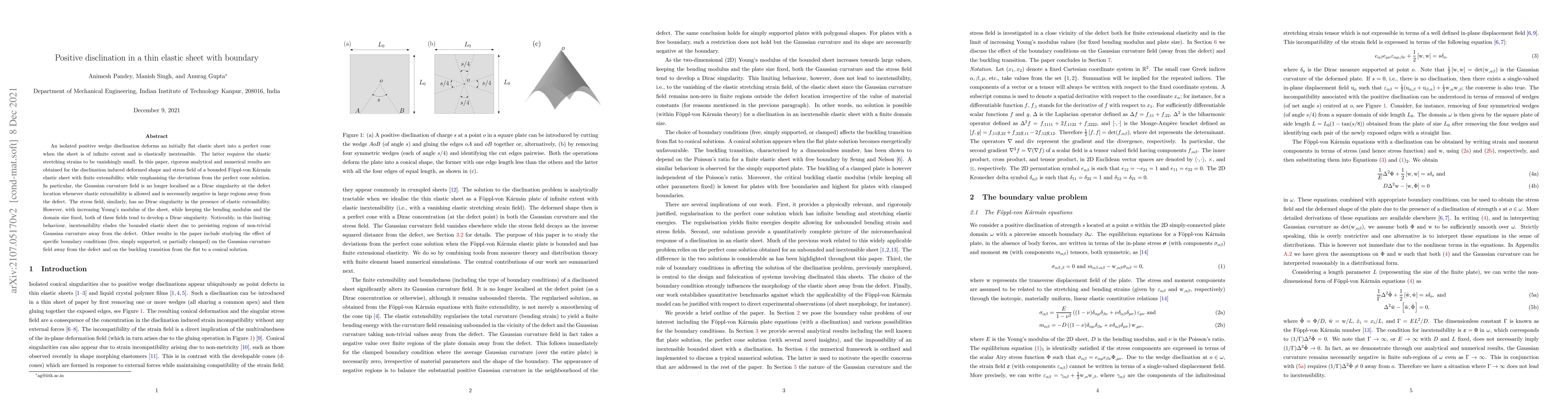 Researchers studied how a thin elastic sheet with a positive disclination bends into a cone shape, finding that allowing the sheet to flex affects its curvature field and stress distribution.