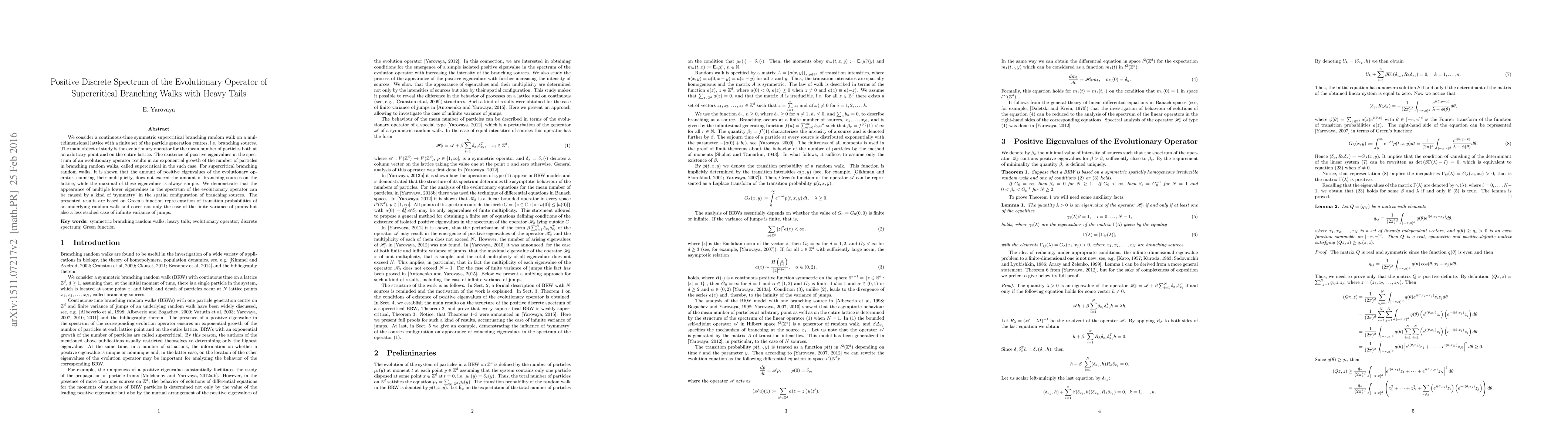This paper investigates the evolutionary operator of supercritical branching random walks on a multidimensional lattice, focusing on the existence of positive discrete eigenvalues. It demonstrates that the number of positive eigenvalues is bounded by the number of branching sources and that the largest eigenvalue is always unique.