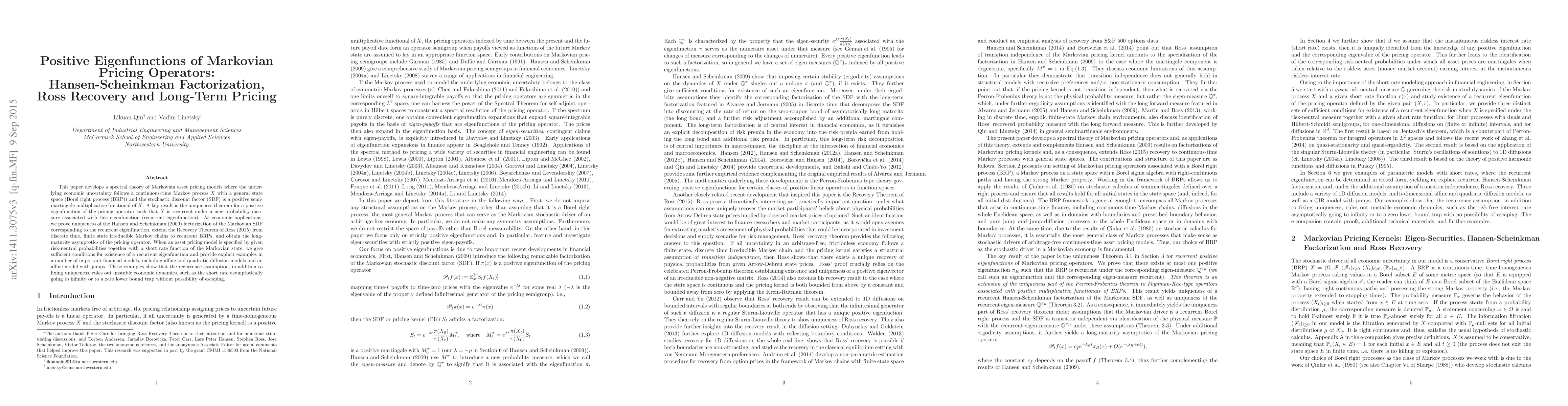 This paper develops a spectral theory for Markovian asset pricing models, proving uniqueness of positive eigenfunctions of the pricing operator under recurrent conditions. It extends the Hansen-Scheinkman factorization, Ross Recovery Theorem, and provides long-term pricing asymptotics, while ensuring stable economic dynamics through recurrence assumptions.