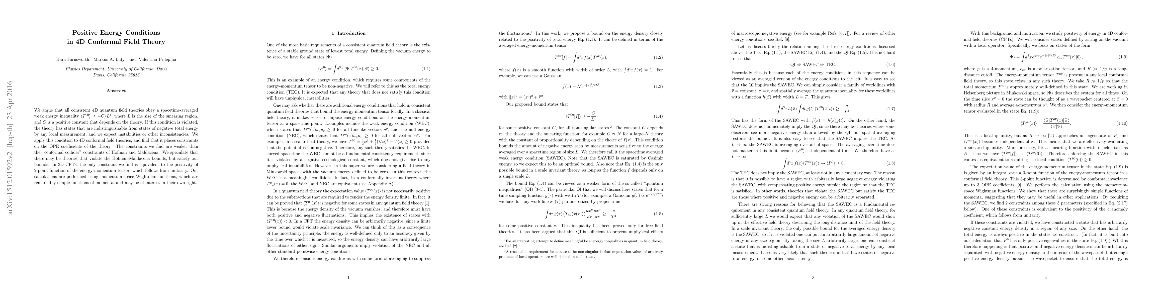 This paper argues that all consistent 4D quantum field theories must satisfy a spacetime-averaged weak energy inequality, placing constraints on the OPE coefficients of 4D conformal field theories. The derived constraints are weaker than the "conformal collider" bounds, suggesting the existence of theories that violate the former but satisfy the latter.