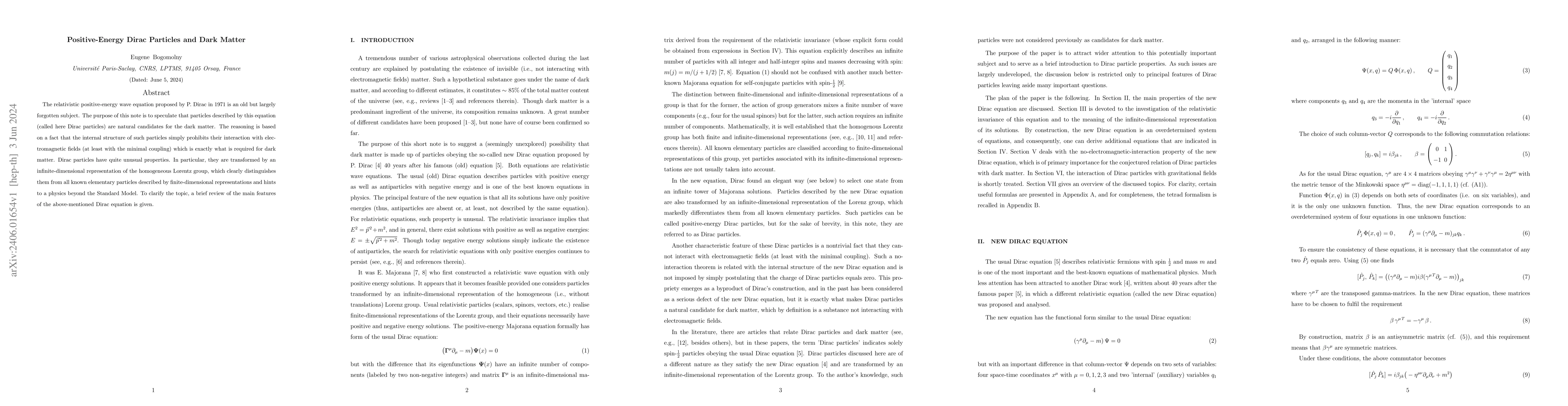 This paper speculates that particles described by Dirac's 1971 relativistic positive-energy wave equation (Dirac particles) could be natural candidates for dark matter due to their non-interaction with electromagnetic fields. These particles exhibit unusual properties, including transformation via an infinite-dimensional representation of the Lorentz group, suggesting physics beyond the Standard Model.