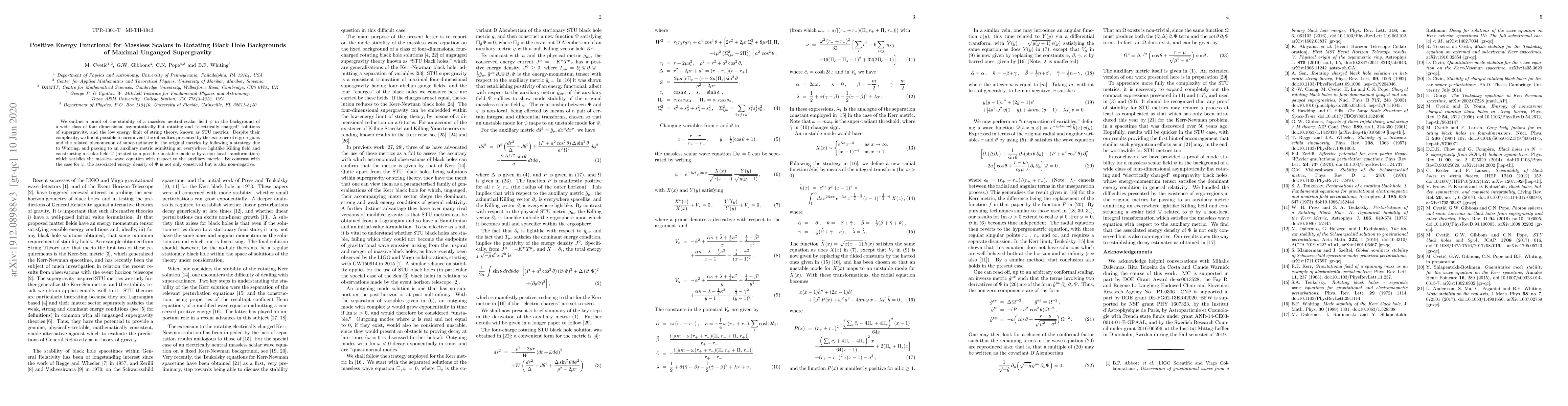 Researchers develop a positive energy functional for massless scalars in rotating black holes, addressing stability issues with ergo-regions and super-radiance. They create an auxiliary metric to construct a new scalar field that satisfies the massless wave equation with non-negative energy density.