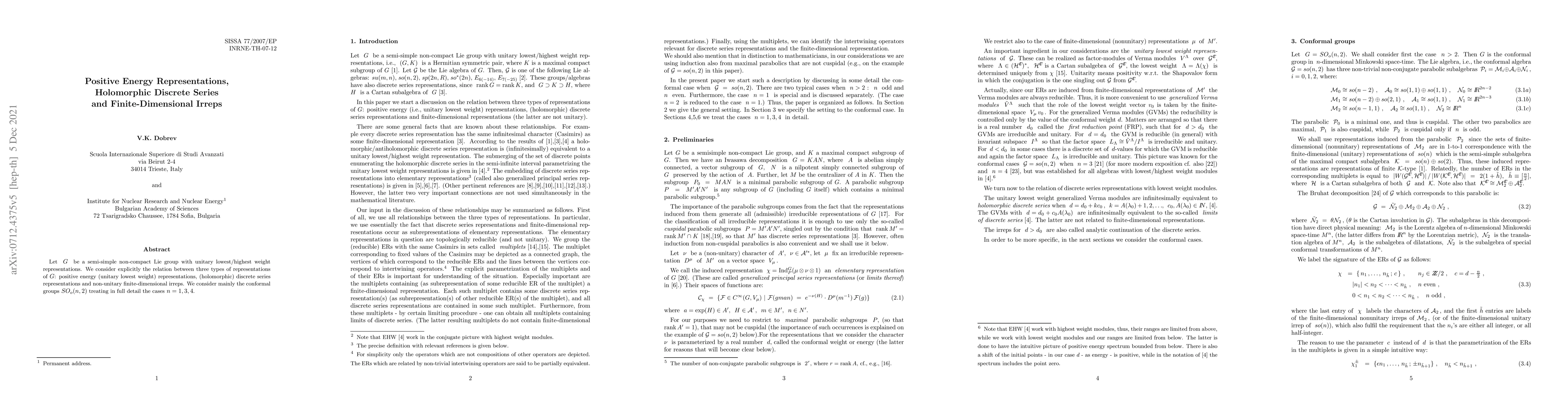 This paper explores the connections between positive energy representations, holomorphic discrete series, and finite-dimensional irreducible representations of the semi-simple non-compact Lie group G, focusing on the conformal groups SO(n,2) with detailed analysis for n=1,3,4.