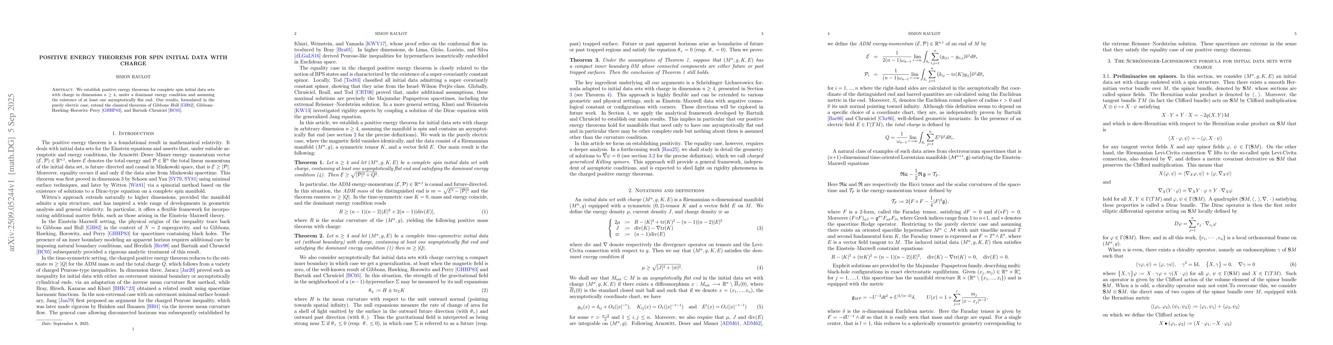 We establish positive energy theorems for complete spin initial data sets with charge in dimensions $n \geq 4$, under a dominant energy condition and assuming the existence of at least one asymptotically flat end. Our results, formulated in the purely electric case, extend the classical theorems of Gibbons--Hull~\cite{GibbonsHull}, Gibbons--Hawking--Horowitz--Perry~\cite{GibbonsHawkingHorowitzPerry}, and Bartnik--Chru\'sciel~\cite{BartnikChrusciel}.