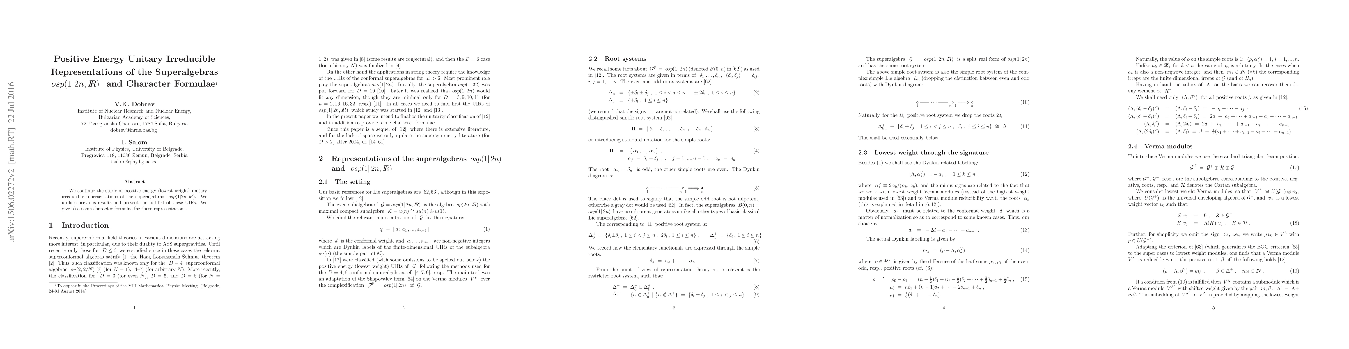 This paper updates the classification of positive energy unitary irreducible representations (UIRs) for the superalgebras $osp(1|2n,R)$ and provides a complete list of these UIRs. Additionally, it presents character formulae for these representations.