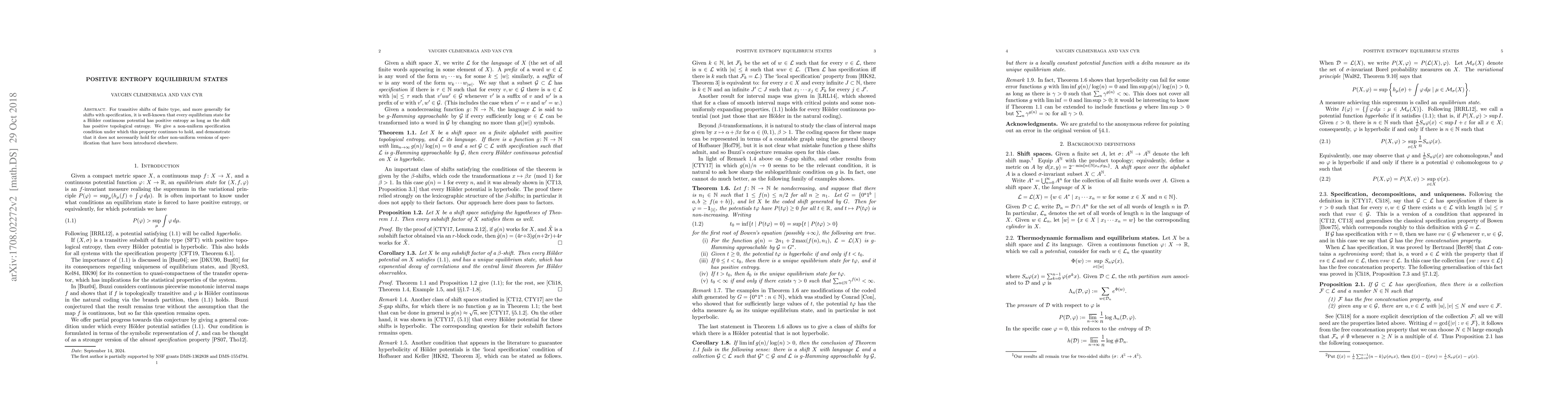 For transitive shifts of finite type, and more generally for shifts with specification, it is well-known that every equilibrium state for a Holder continuous potential has positive entropy as long as the shift has positive topological entropy. We give a non-uniform specification condition under which this property continues to hold, and demonstrate that it does not necessarily hold for other non-uniform versions of specification that have been introduced elsewhere.