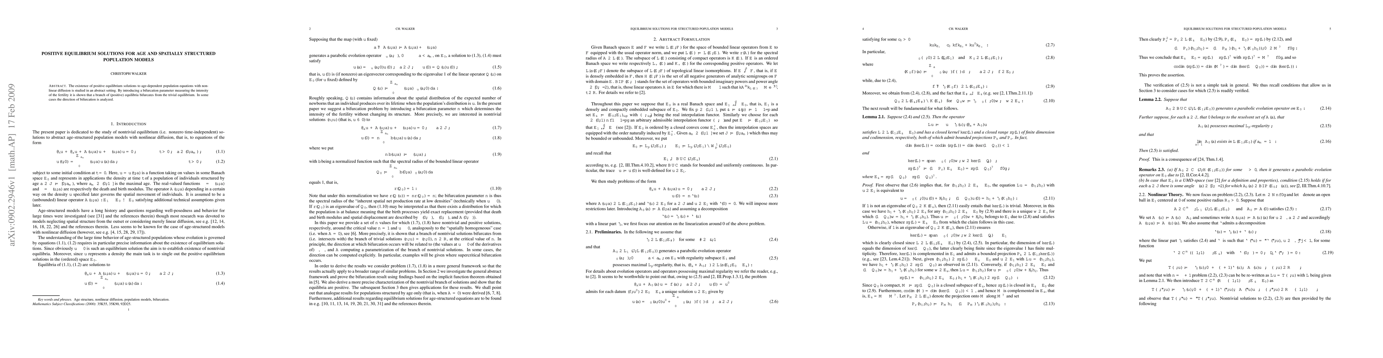 This research explores the existence of positive population equilibrium solutions in age and spatially structured models using abstract settings. It introduces a fertility intensity parameter and demonstrates a branch of positive equilibria bifurcating from the trivial equilibrium, with direction analysis in certain cases.