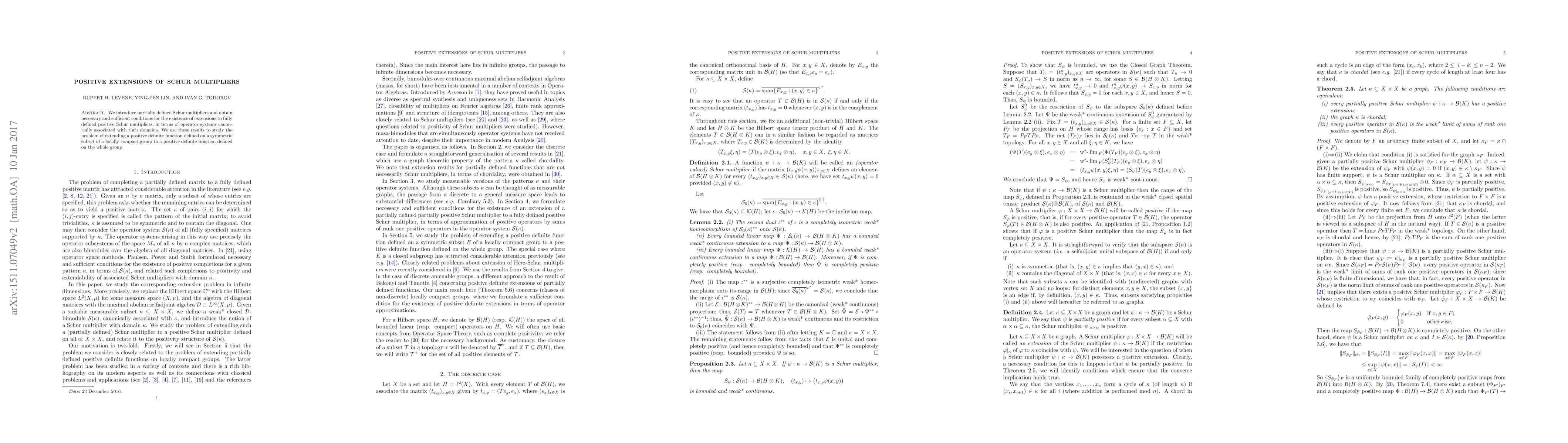This paper introduces partially defined Schur multipliers and provides conditions for extending them to fully defined positive Schur multipliers. It also explores extending positive definite functions on symmetric subsets of locally compact groups to the entire group.