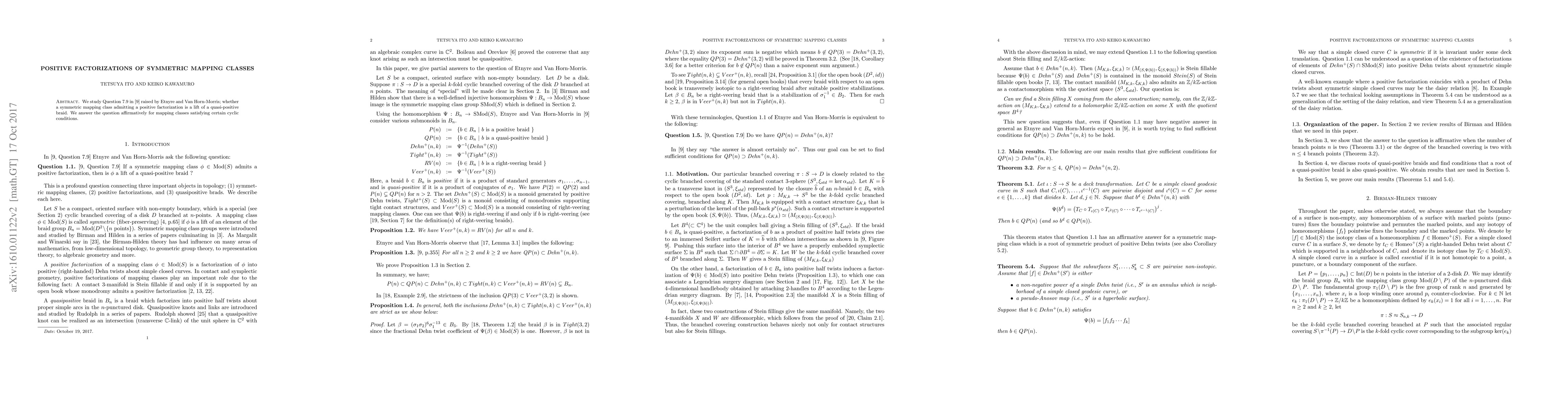 Summary: The paper confirms that under specific cyclic conditions, a symmetric mapping class that can be positively factorized is indeed a lift of a quasi-positive braid, addressing Question 7.9 from Etnyre and Van Horn-Morris's work on monoids in the mapping class group.