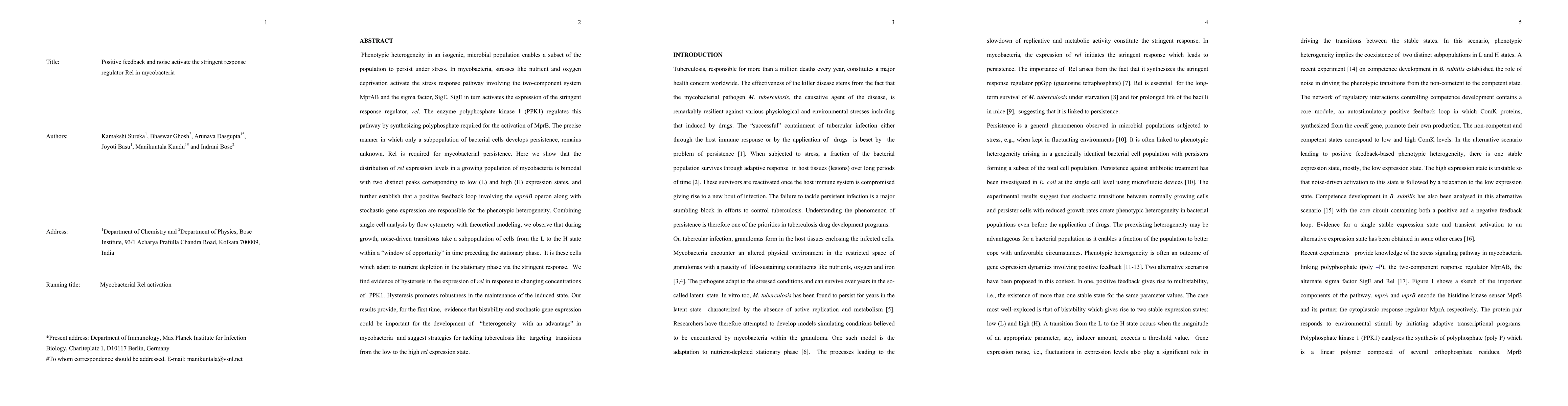 This paper demonstrates that positive feedback and noise drive the bimodal expression of the stringent response regulator Rel in mycobacteria, leading to phenotypic heterogeneity. It reveals that stochastic transitions and bistability, influenced by polyphosphate kinase 1, enable a subset of cells to persist under stress.