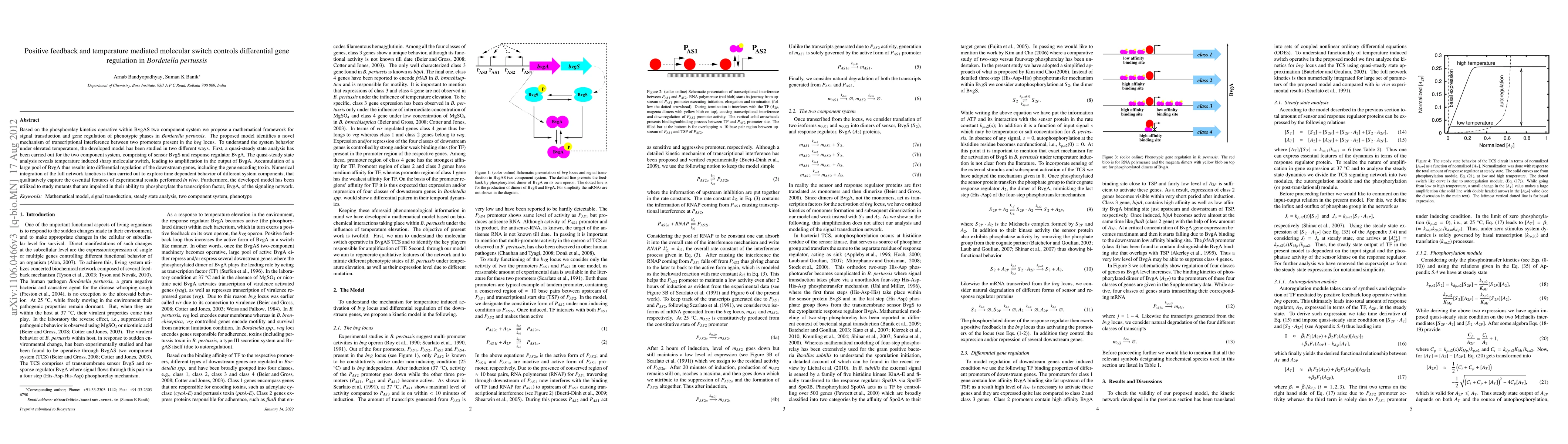 Based on the phosphorelay kinetics operative within BvgAS two component system we propose a mathematical framework for signal transduction and gene regulation of phenotypic phases in Bordetella pertussis. The proposed model identifies a novel mechanism of transcriptional interference between two promoters present in the bvg locus. To understand the system behavior under elevated temperature, the developed model has been studied in two different ways. First, a quasi-steady state analysis has been carried out for the two component system, comprising of sensor BvgS and response regulator BvgA. The quasi-steady state analysis reveals temperature induced sharp molecular switch, leading to amplification in the output of BvgA. Accumulation of a large pool of BvgA thus results into differential regulation of the downstream genes, including the gene encoding toxin. Numerical integration of the full network kinetics is then carried out to explore time dependent behavior of different system components, that qualitatively capture the essential features of experimental results performed in vivo. Furthermore, the developed model has been utilized to study mutants that are impaired in their ability to phosphorylate the transcription factor, BvgA, of the signaling network.