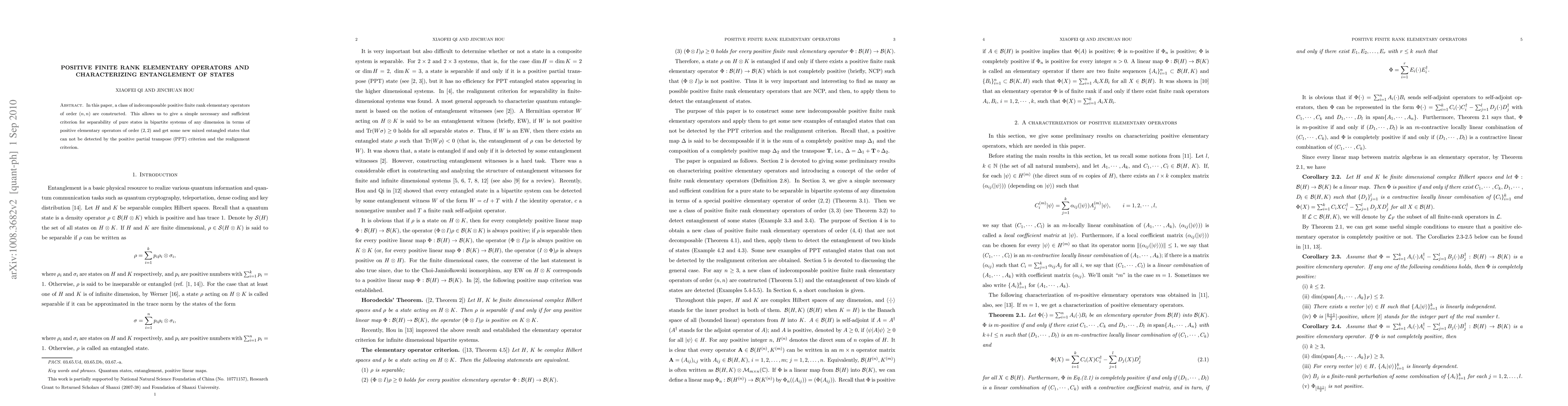 In this paper, a class of indecomposable positive finite rank elementary operators of order $(n,n)$ are constructed. This allows us to give a simple necessary and sufficient criterion for separability of pure states in bipartite systems of any dimension in terms of positive elementary operators of order $(2,2)$ and get some new mixed entangled states that can not be detected by the positive partial transpose (PPT) criterion and the realignment criterion.