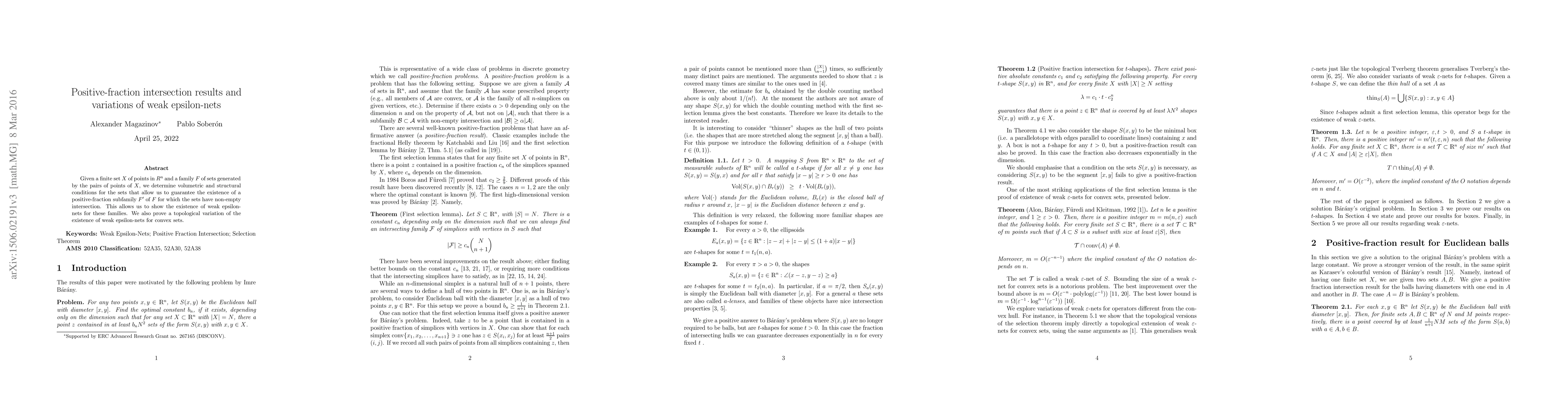 Given a finite set $X$ of points in $R^n$ and a family $F$ of sets generated by the pairs of points of $X$, we determine volumetric and structural conditions for the sets that allow us to guarantee the existence of a positive-fraction subfamily $F'$ of $F$ for which the sets have non-empty intersection. This allows us to show the existence of weak epsilon-nets for these families. We also prove a topological variation of the existence of weak epsilon-nets for convex sets.