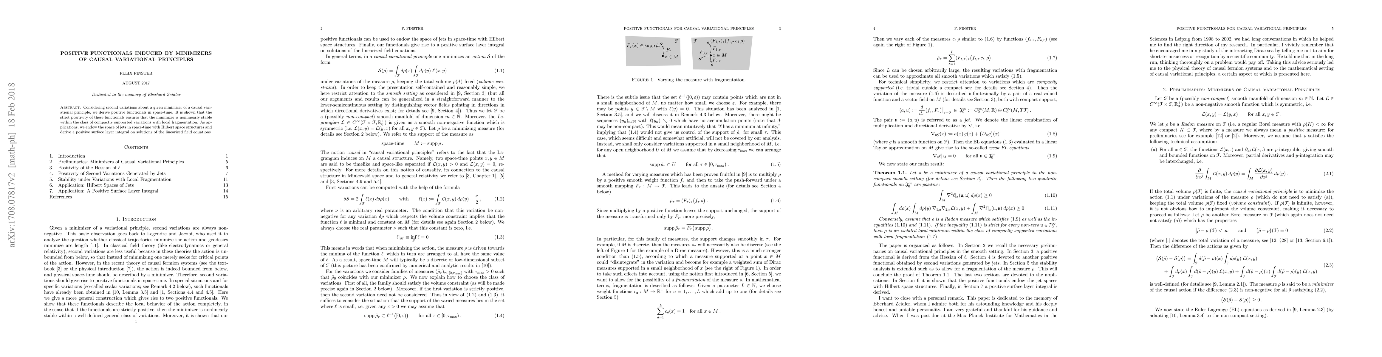 This paper derives positive functionals from second variations about a minimizer of a causal variational principle, demonstrating their strict positivity ensures nonlinear stability. The study also introduces Hilbert space structures on the space of jets and derives a positive surface layer integral for solutions of linearized field equations.