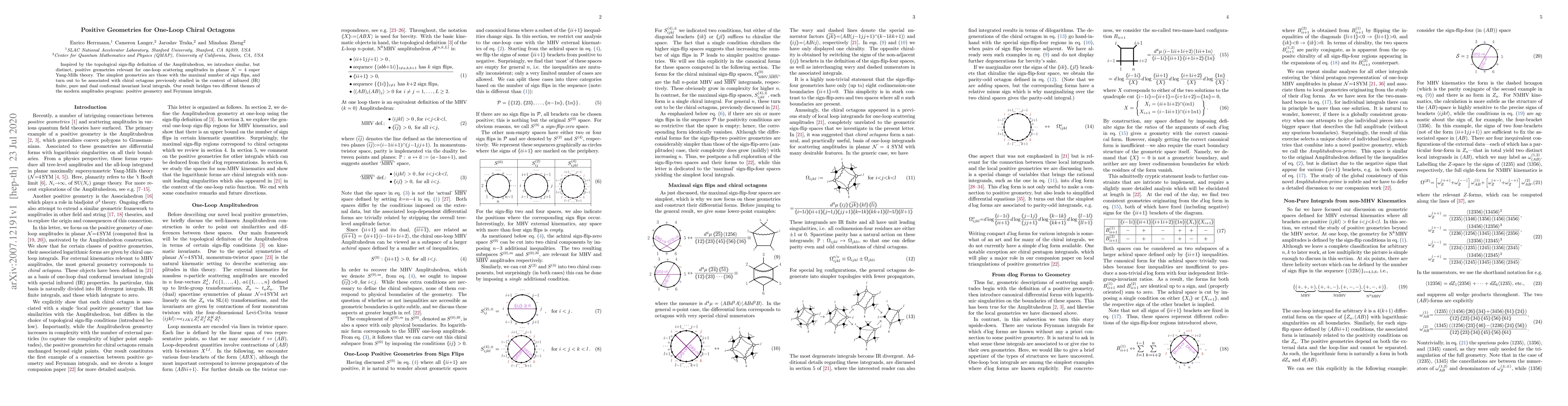 Inspired by the topological sign-flip definition of the Amplituhedron, we introduce similar, but distinct, positive geometries relevant for one-loop scattering amplitudes in planar $\mathcal{N}=4$ super Yang-Mills theory. The simplest geometries are those with the maximal number of sign flips, and turn out to be associated with chiral octagons previously studied in the context of infrared (IR) finite, pure and dual conformal invariant local integrals. Our result bridges two different themes of the modern amplitudes program: positive geometry and Feynman integrals.
