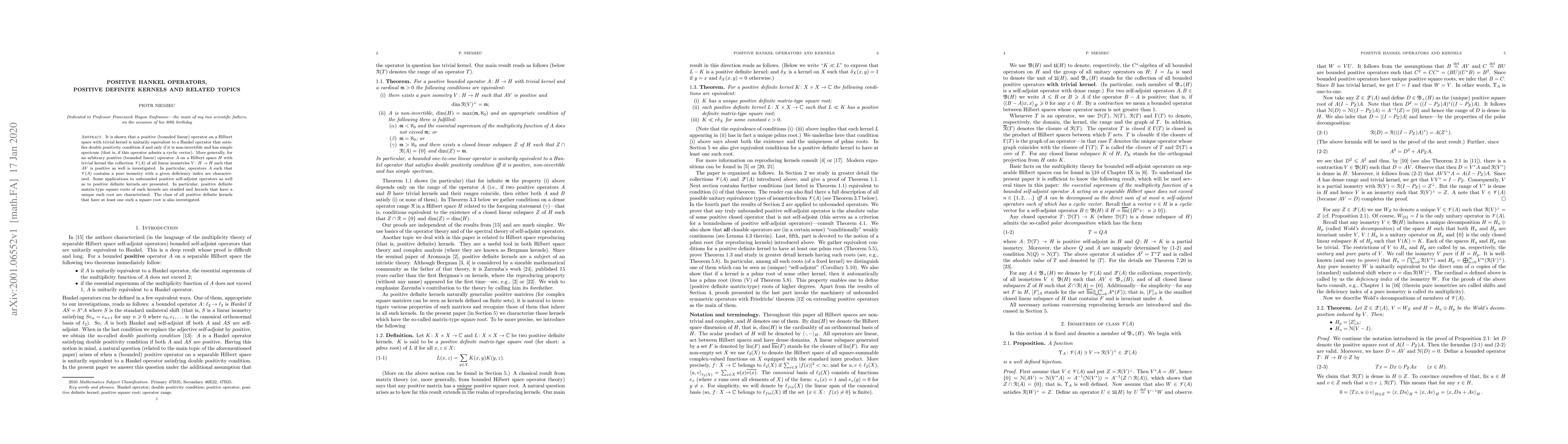 It is shown that a positive (bounded linear) operator on a Hilbert space with trivial kernel is unitarily equivalent to a Hankel operator that satisfies double positivity condition if and only if it is non-invertible and has simple spectrum (that is, if this operator admits a cyclic vector). More generally, for an arbitrary positive (bounded linear) operator A on a Hilbert space H with trivial kernel the collection V(A) of all linear isometries V from H into H such that AV is positive as well is investigated. In particular, operators A such that V(A) contains a pure isometry with a given deficiency index are characterized. Some applications to unbounded positive self-adjoint operators as well as to positive definite kernels are presented. In particular, positive definite matrix-type square roots of such kernels are studied and kernels that have a unique such root are characterized. The class of all positive definite kernels that have at least one such a square root is also investigated.