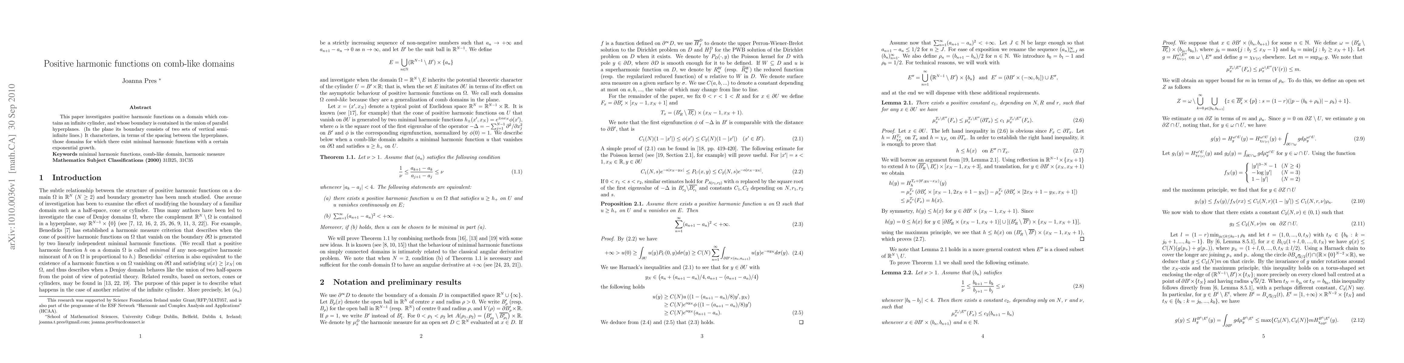 This paper explores positive harmonic functions on a comb-like domain containing an infinite cylinder, focusing on the existence of minimal harmonic functions with exponential growth, characterized by the spacing between parallel bounding hyperplanes.