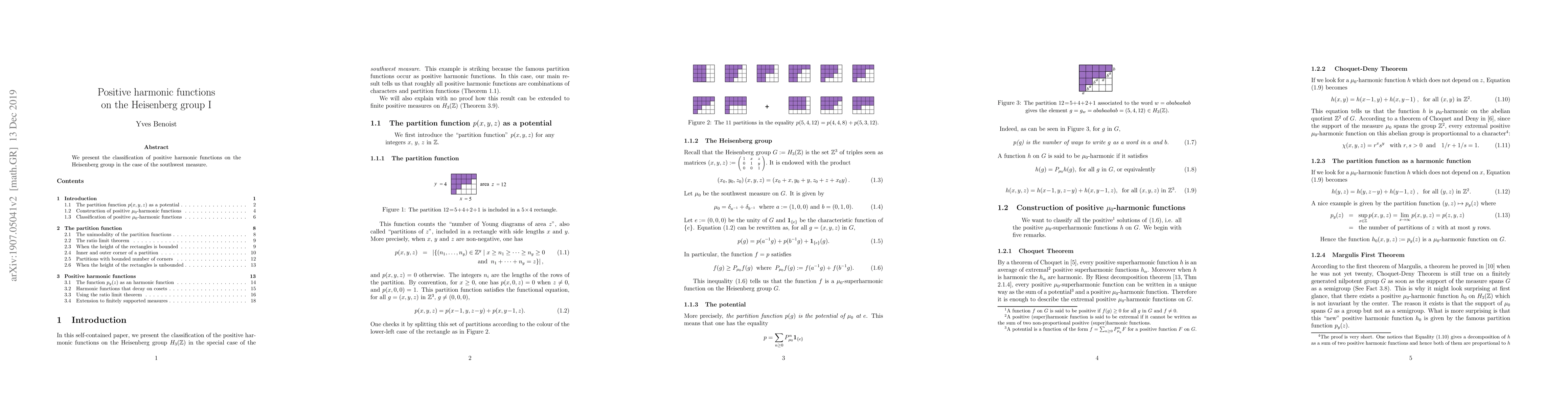 We present the classification of positive harmonic functions on the Heisenberg group in the case of the southwest measure.