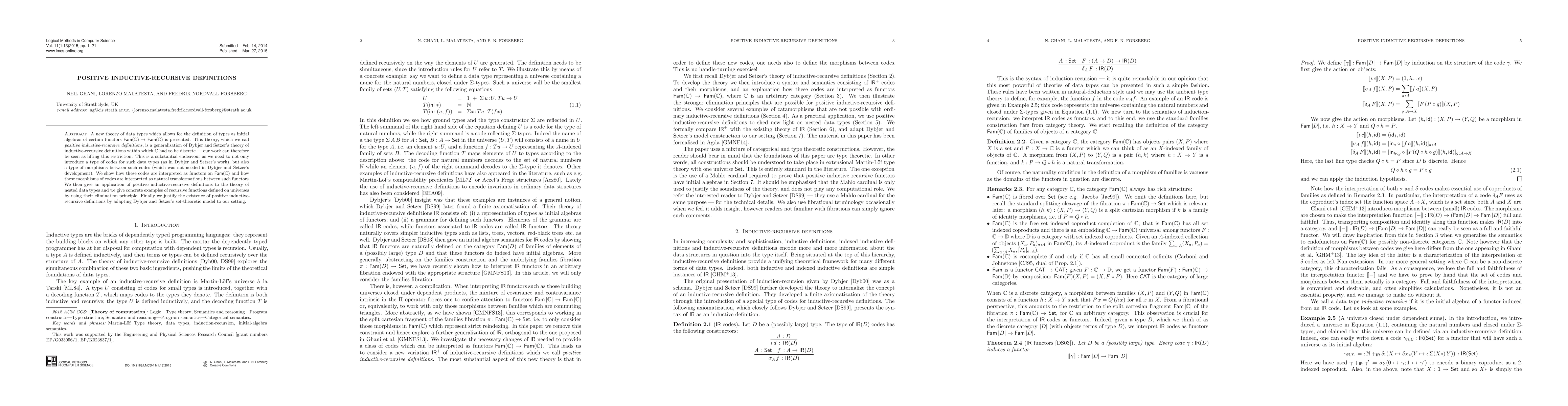 This paper introduces a new theory of positive inductive-recursive definitions, generalizing Dybjer and Setzer's inductive-recursive definitions by removing the discreteness requirement on C. It provides codes and morphisms for data types, interpreted as functors and natural transformations, and applies the theory to nested data types and recursive functions.