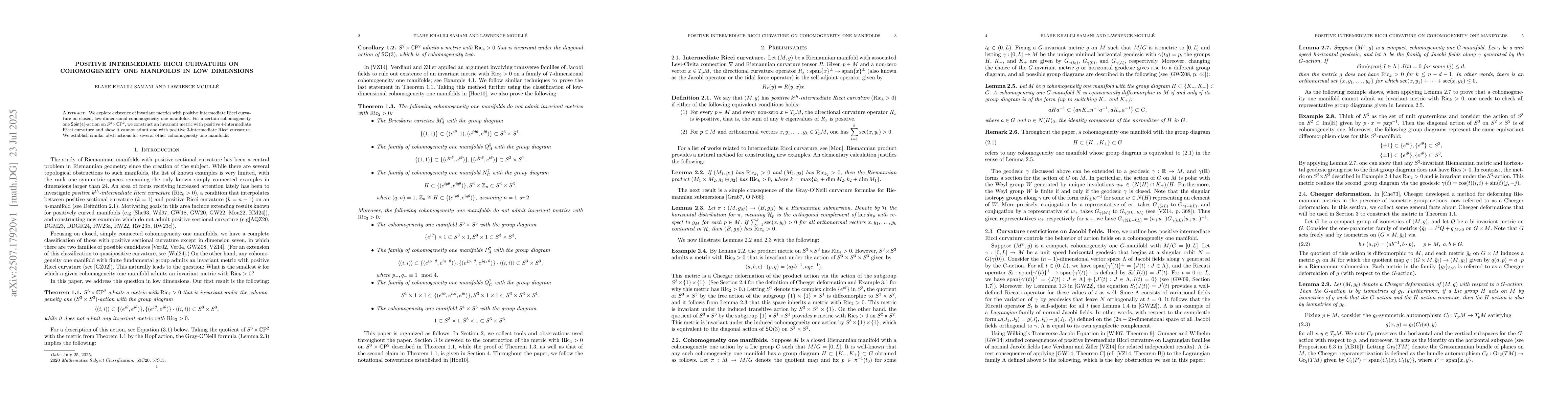 We explore existence of invariant metrics with positive intermediate Ricci curvature on closed, low-dimensional cohomogeneity one manifolds. For a certain cohomogeneity one $\mathsf{Spin}(4)$-action on $S^3 \times \mathbb{C}\mathrm{P}^2$, we construct an invariant metric with positive $4$-intermediate Ricci curvature and show it cannot admit one with positive $3$-intermediate Ricci curvature. We establish similar obstructions for several other cohomogeneity one manifolds.