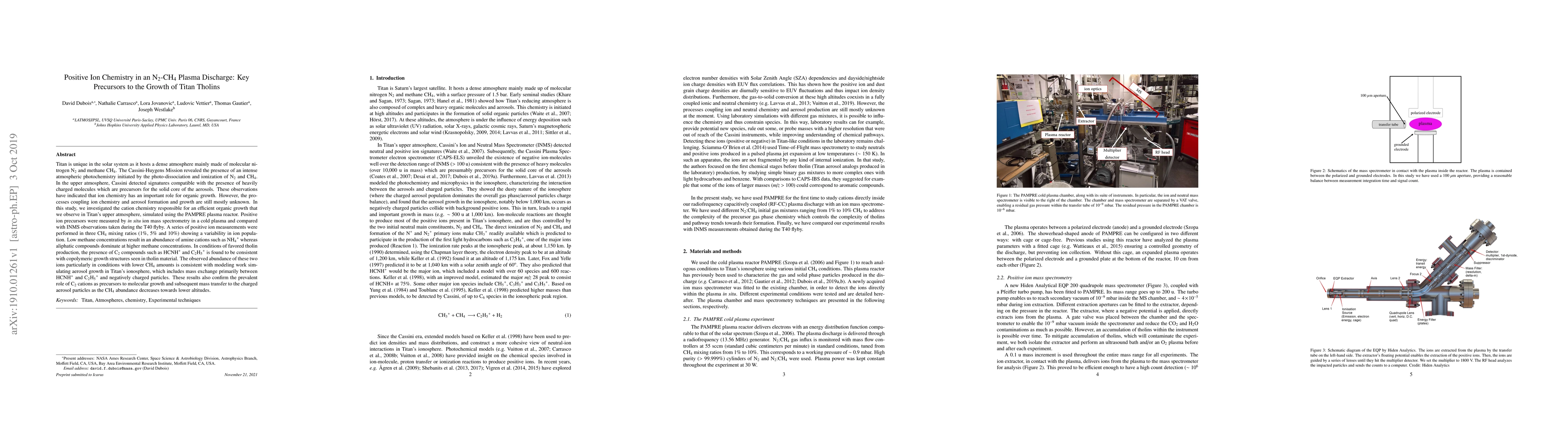 Titan is unique in the solar system as it hosts a dense atmosphere mainly made of N$_2$ and CH$_4$. Cassini-Huygens revealed the presence of an intense atmospheric photochemistry initiated by the photo-dissociation and ionization of N$_2$ and CH$_4$. In the upper atmosphere, Cassini detected signatures compatible with the presence of heavily charged molecules, precursors for the solid core of the aerosols. However, the processes coupling ion chemistry and aerosol formation and growth are still mostly unknown. In this study, we investigated the cation chemistry responsible for an efficient organic growth that we observe in Titan's upper atmosphere, simulated using the PAMPRE plasma reactor. Cation precursors were measured by in situ ion mass spectrometry in a cold plasma and compared with INMS observations taken during the T40 flyby. A series of positive ion measurements were performed in three CH$_4$ mixing ratios (1%, 5% and 10%) showing a variability in ion population. Low CH$_4$ concentrations result in an abundance of amine cations such as NH$_4^+$ whereas aliphatic compounds dominate at higher methane concentrations. In conditions of favored tholin production, the presence of C2 compounds such as HCNH$^+$ and C$_2$H$_5^+$ is found to be consistent with copolymeric growth structures seen in tholin material. The observed abundance of these two ions particularly in conditions with lower CH$_4$ amounts is consistent with modeling work simulating aerosol growth in Titan's ionosphere, which includes mass exchange primarily between HCNH$^+$ and C$_2$H$_5^+$ and negatively charged particles. These results also confirm the prevalent role of C2 cations as precursors to molecular growth and subsequent mass transfer to the charged aerosol particles as the CH$_4$ abundance decreases towards lower altitudes.