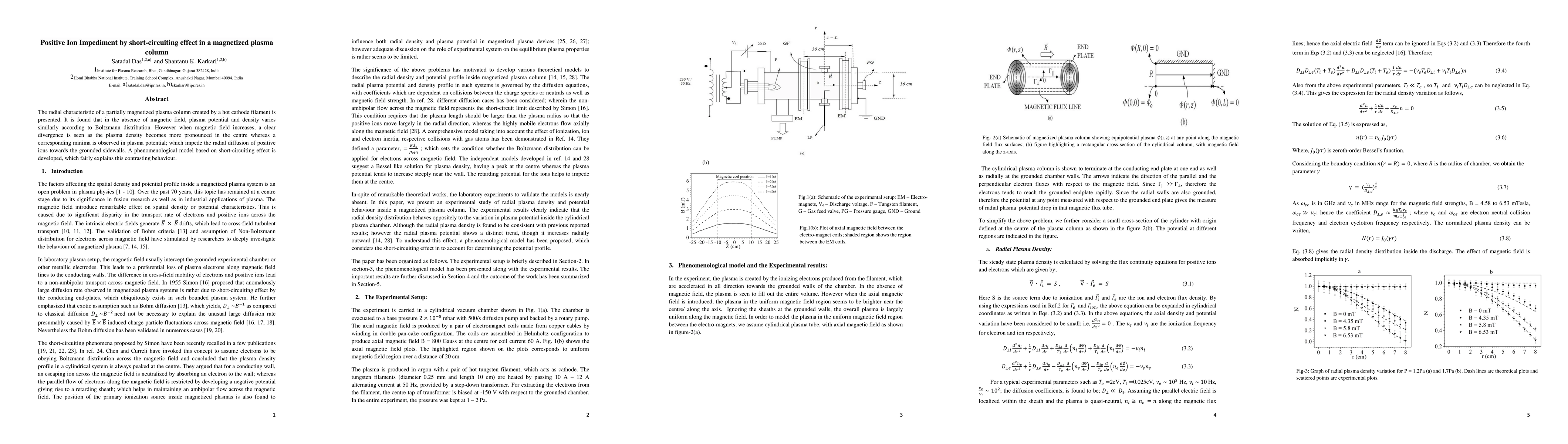 The radial characteristic of a partially magnetized plasma column created by a hot cathode filament is presented. It is found that in the absence of magnetic field, plasma potential and density varies similarly according to Boltzmann distribution. However as the magnetic field increases, a clear divergence is seen as plasma density becomes more pronounced in the centre whereas a corresponding minima is observed in plasma potential; thus limiting the radial diffusion of positive ions towards the grounded sidewalls. A phenomenological model based on short-circuiting effect is developed, which fairly explains this contrasting behaviour.