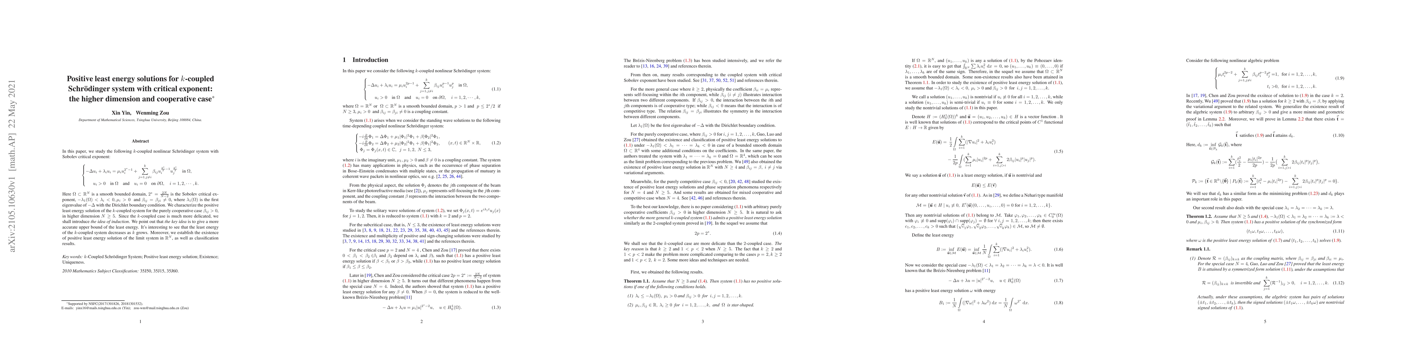 In this paper, we study the following $k$-coupled nonlinear Schr\"odinger system with Sobolev critical exponent: \begin{equation*} \left\{ \begin{aligned} -\Delta u_i & +\lambda_iu_i =\mu_i u_i^{2^*-1}+\sum_{j=1,j\ne i}^{k} \beta_{ij} u_{i}^{\frac{2^*}{2}-1}u_{j}^{\frac{2^*}{2}} \quad \hbox{in}\;\Omega,\newline u_i&>0 \quad \hbox{in}\; \Omega \quad \hbox{and}\quad u_i=0 \quad \hbox{on}\;\partial\Omega, \quad i=1,2,\cdots, k. \end{aligned} \right. \end{equation*} Here $\Omega\subset \mathbb{R}^N $ is a smooth bounded domain, $2^{*}=\frac{2N}{N-2}$ is the Sobolev critical exponent, $-\lambda_1(\Omega)<\lambda_i<0, \mu_i>0$ and $ \beta_{ij}=\beta_{ji}\ne 0$, where $\lambda_1(\Omega)$ is the first eigenvalue of $-\Delta$ with the Dirichlet boundary condition. We characterize the positive least energy solution of the $k$-coupled system for the purely cooperative case $\beta_{ij}>0$, in higher dimension $N\ge 5$. Since the $k$-coupled case is much more delicated, we shall introduce the idea of induction. We point out that the key idea is to give a more accurate upper bound of the least energy. It's interesting to see that the least energy of the $k$-coupled system decreases as $k$ grows. Moreover, we establish the existence of positive least energy solution of the limit system in $\mathbb{R}^N$, as well as classification results.