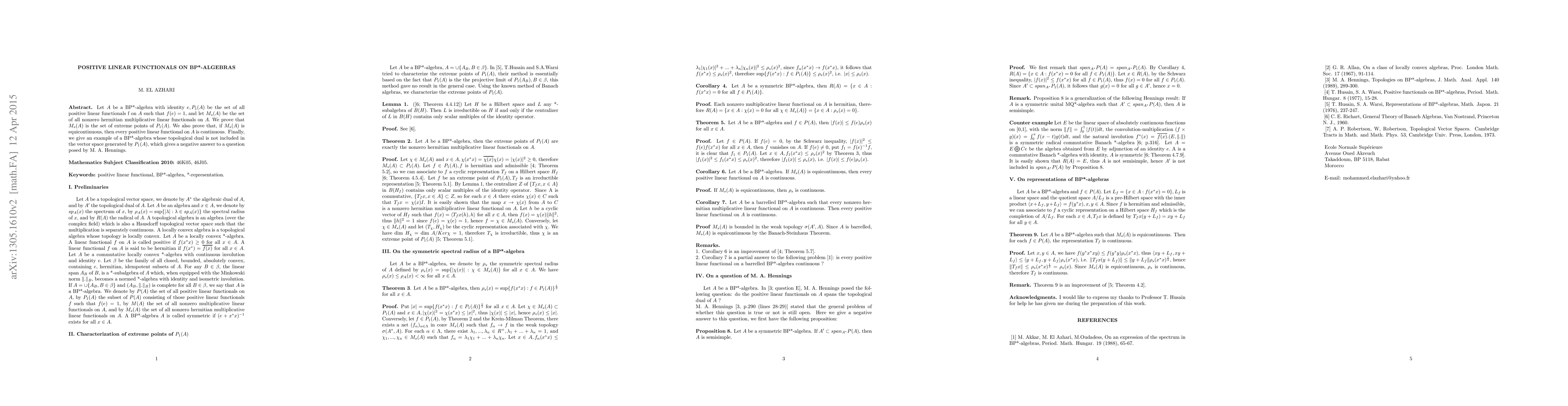 Let A be a BP*-algebra with identity e, P_{1}(A) be the set of all positive linear functionals f on A such that f(e) = 1, and let M_{s}(A) be the set of all nonzero hermitian multiplicative linear functionals on A. We prove that M_{s}(A) is the set of extreme points of P_{1}(A). We also prove that, if M_{s}(A) is equicontinuous, then every positive linear functional on A is continuous. Finally, we give an example of a BP*-algebra whose topological dual is not included in the vector space generated by P_{1}(A), which gives a negative answer to a question posed by M. A. Hennings.