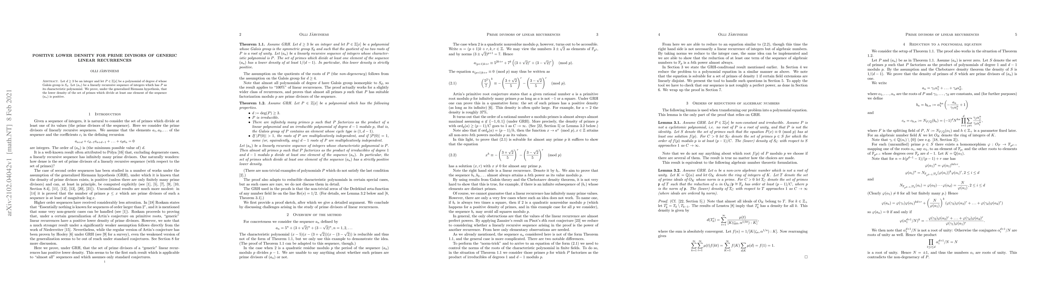 Let $d \ge 3$ be an integer and let $P \in \mathbb{Z}[x]$ be a polynomial of degree $d$ whose Galois group is $S_d$. Let $(a_n)$ be a linearly recuresive sequence of integers which has $P$ as its characteristic polynomial. We prove, under the generalized Riemann hypothesis, that the lower density of the set of primes which divide at least one element of the sequence $(a_n)$ is positive.