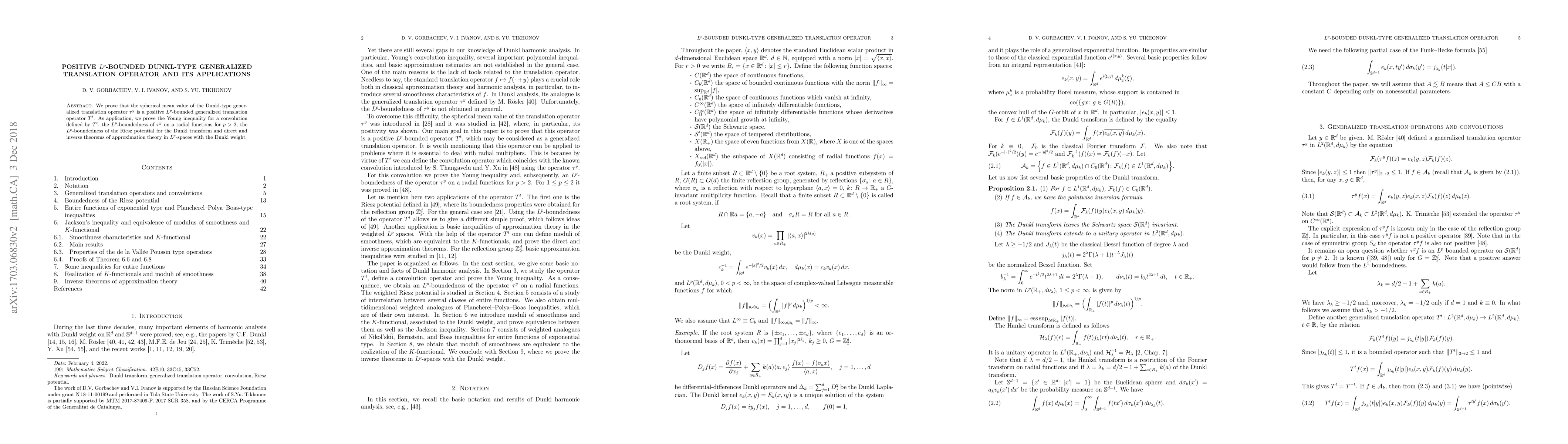 This paper proves that a specific operator is positive $L^p$-bounded and uses it to prove various inequalities and theorems related to approximation theory in $L^p$-spaces with a Dunkl weight.