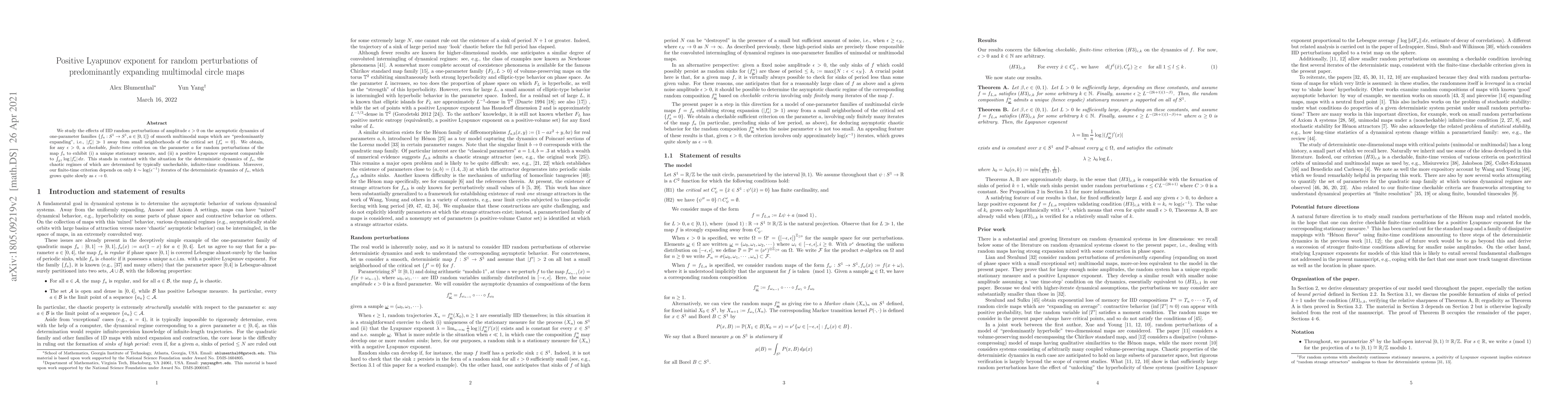 We study the effects of IID random perturbations of amplitude $\epsilon > 0$ on the asymptotic dynamics of one-parameter families $\{f_a : S^1 \to S^1, a \in [0,1]\}$ of smooth multimodal maps which "predominantly expanding", i.e., $|f'_a| \gg 1$ away from small neighborhoods of the critical set $\{ f'_a = 0 \}$. We obtain, for any $\epsilon > 0$, a \emph{checkable, finite-time} criterion on the parameter $a$ for random perturbations of the map $f_a$ to exhibit (i) a unique stationary measure, and (ii) a positive Lyapunov exponent comparable to $\int_{S^1} \log |f_a'| \, dx$. This stands in contrast with the situation for the deterministic dynamics of $f_a$, the chaotic regimes of which are determined by typically uncheckable, infinite-time conditions. Moreover, our finite-time criterion depends on only $k \sim \log (\epsilon^{-1})$ iterates of the deterministic dynamics of $f_a$, which grows quite slowly as $\epsilon \to 0$.