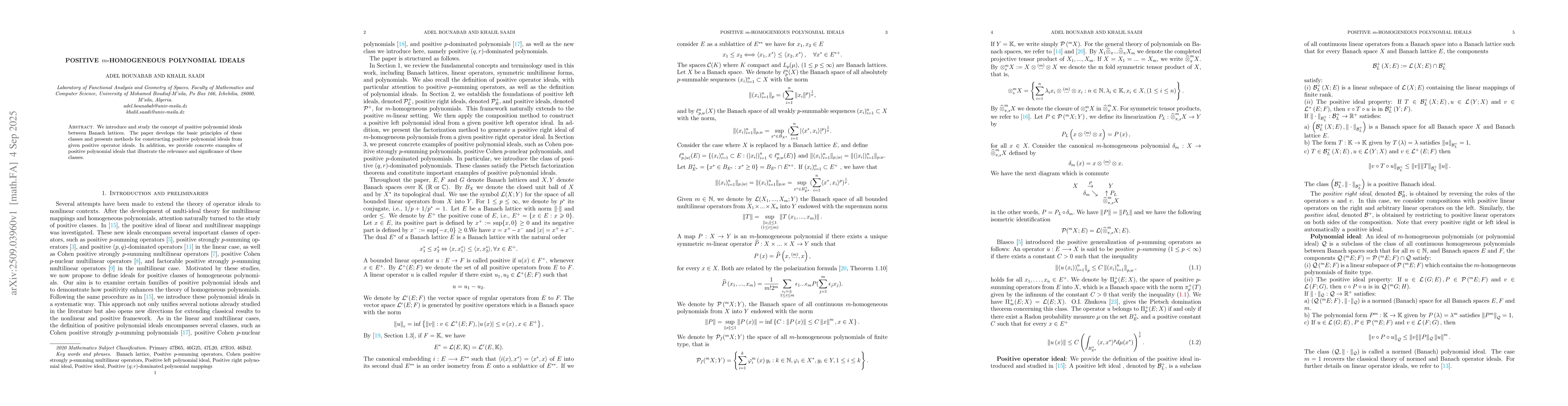 We introduce and study the concept of positive polynomial ideals between Banach lattices. The paper develops the basic principles of these classes and presents methods for constructing positive polynomial ideals from given positive operator ideals. In addition, we provide concrete examples of positive polynomial ideals that illustrate the relevance and significance of these classes.
