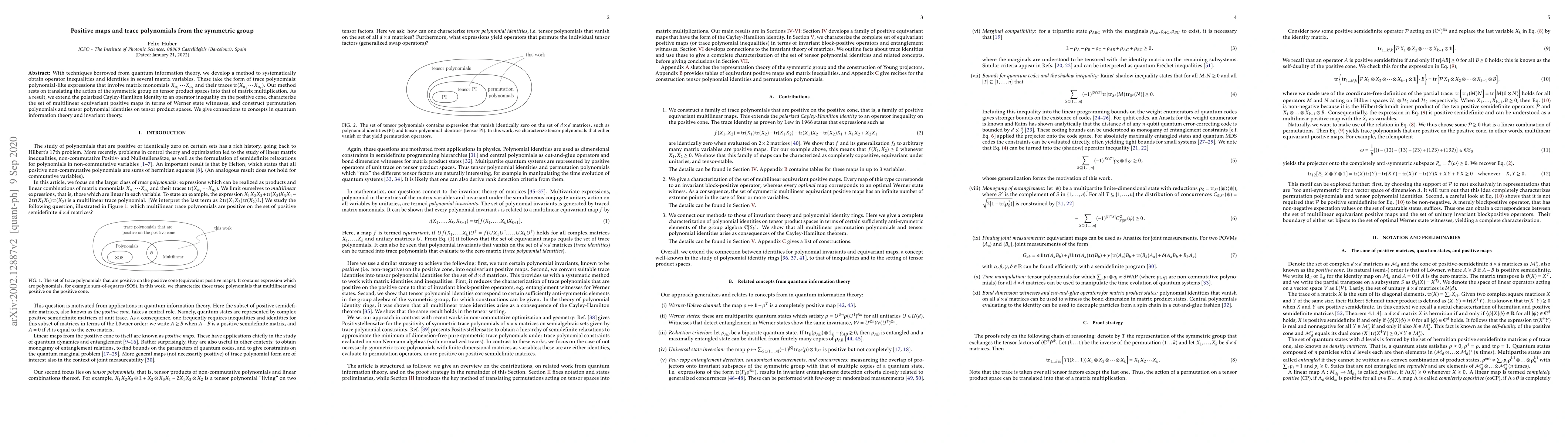 With techniques borrowed from quantum information theory, we develop a method to systematically obtain operator inequalities and identities in several matrix variables. These take the form of trace polynomials: polynomial-like expressions that involve matrix monomials $X_{\alpha_1} \cdots X_{\alpha_r}$ and their traces $\operatorname{tr}(X_{\alpha_1} \cdots X_{\alpha_r})$. Our method rests on translating the action of the symmetric group on tensor product spaces into that of matrix multiplication. As a result, we extend the polarized Cayley-Hamilton identity to an operator inequality on the positive cone, characterize the set of multilinear equivariant positive maps in terms of Werner state witnesses, and construct permutation polynomials and tensor polynomial identities on tensor product spaces. We give connections to concepts in quantum information theory and invariant theory.