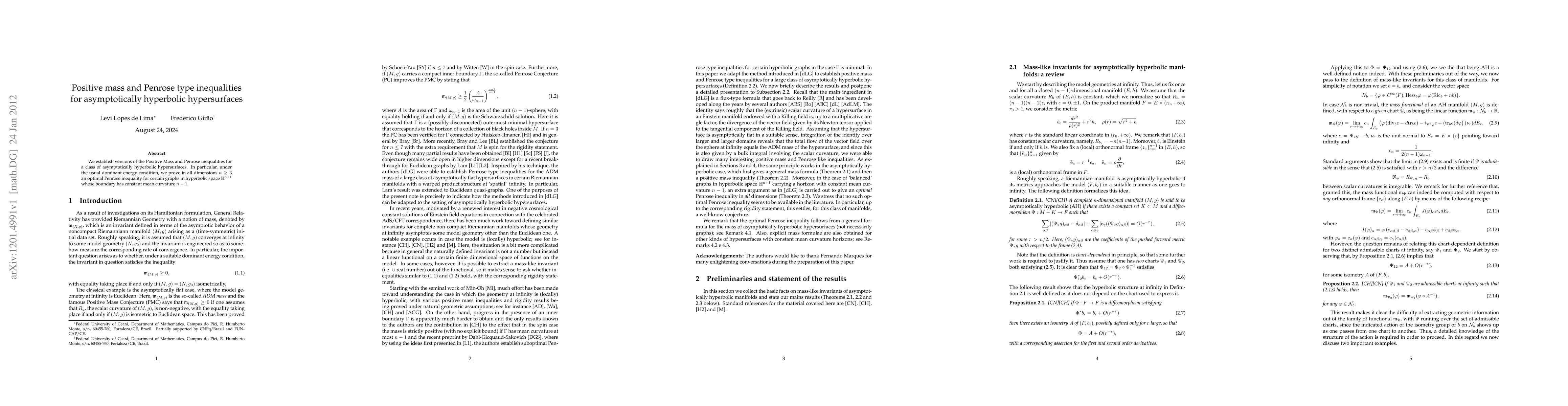 We establish versions of the Positive Mass and Penrose inequalities for a class of asymptotically hyperbolic hypersurfaces. In particular, under the usual dominant energy condition, we prove in all dimensions $n\geq 3$ an optimal Penrose inequality for certain graphs in hyperbolic space $\mathbb H^{n+1}$ whose boundary has constant mean curvature $n-1$.