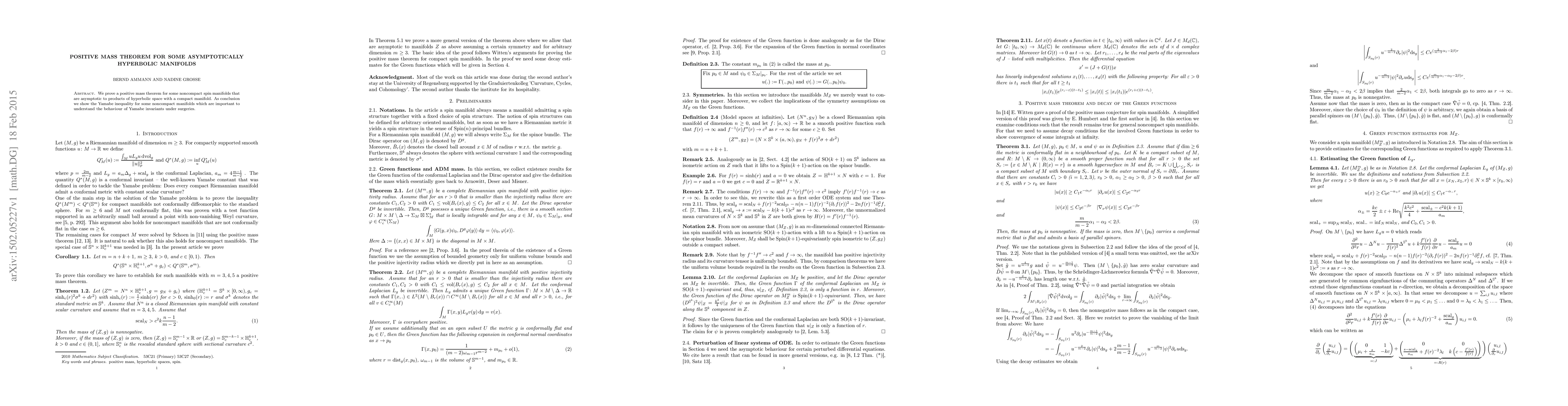 This paper proves a positive mass theorem for noncompact spin manifolds asymptotically similar to hyperbolic space products, and concludes with the Yamabe inequality for these manifolds, crucial for understanding Yamabe invariants in surgical contexts.