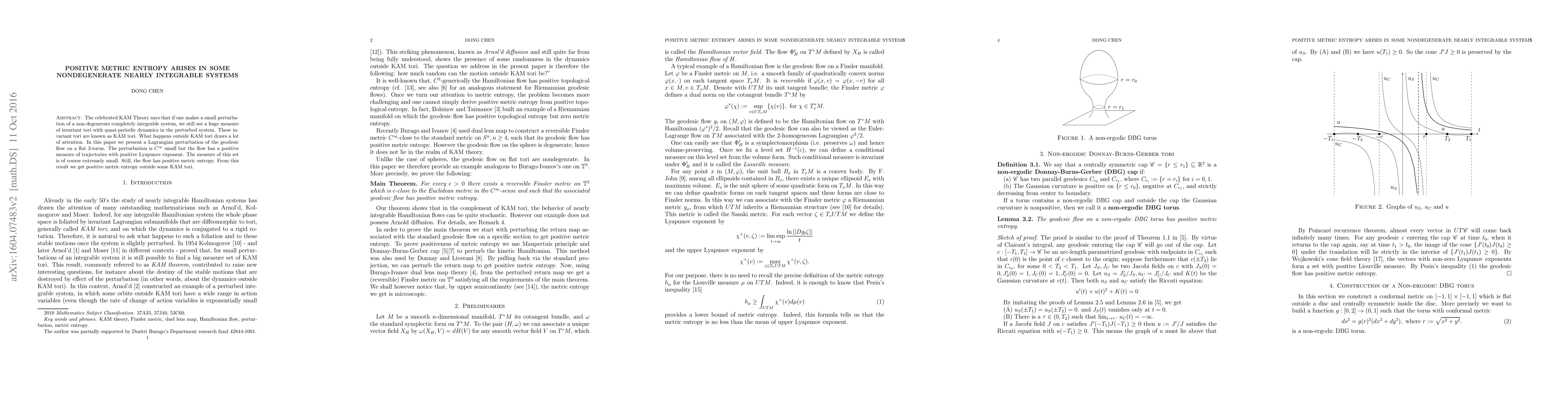 The celebrated KAM Theory says that if one makes a small perturbation of a non-degenerate completely integrable system, we still see a huge measure of invariant tori with quasi-periodic dynamics in the perturbed system. These invariant tori are known as KAM tori. What happens outside KAM tori draws a lot of attention. In this paper we present a Lagrangian perturbation of the geodesic flow on a flat 3-torus. The perturbation is $C^\infty$ small but the flow has a positive measure of trajectories with positive Lyapunov exponent, namely, the flow has positive metric entropy. From this result we get positive metric entropy outside some KAM tori.