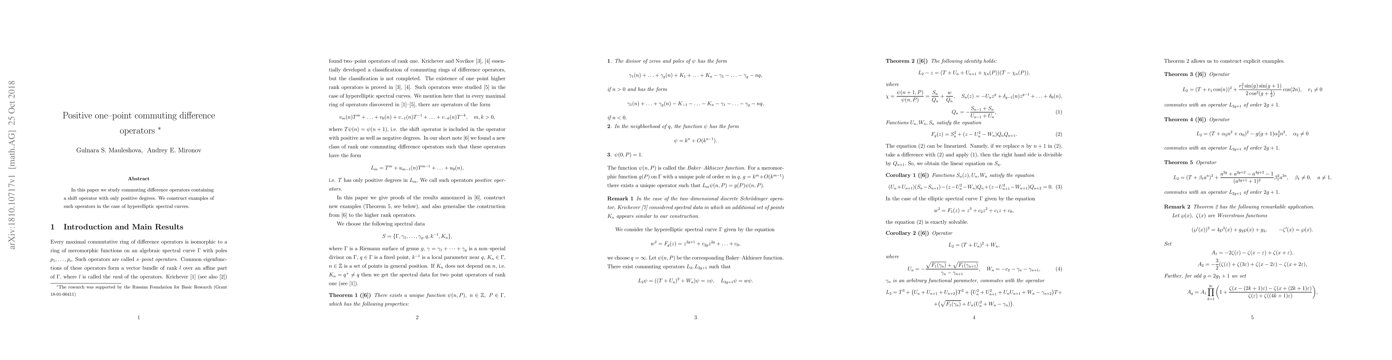 This paper investigates commuting difference operators that include a shift operator with strictly positive degrees, presenting specific examples derived from the spectral properties of hyperelliptic curves. The focus is on the construction and analysis of these operators in a mathematical framework.