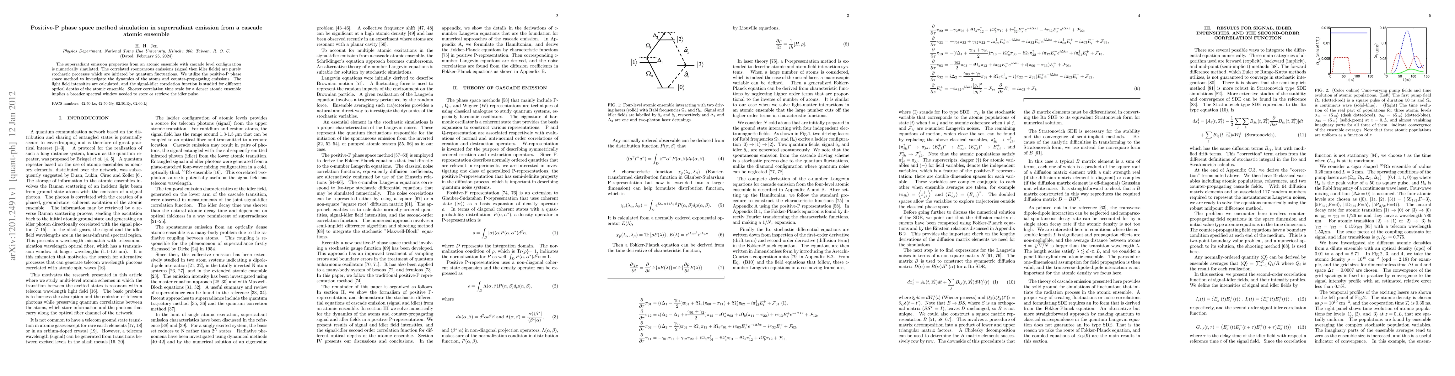 This paper simulates superradiant emission from a cascade atomic ensemble using the positive-P phase space method, focusing on the dynamics of correlated spontaneous emissions and their signal-idler correlation. The study reveals that denser atomic ensembles require broader spectral windows for idler pulse storage or retrieval.