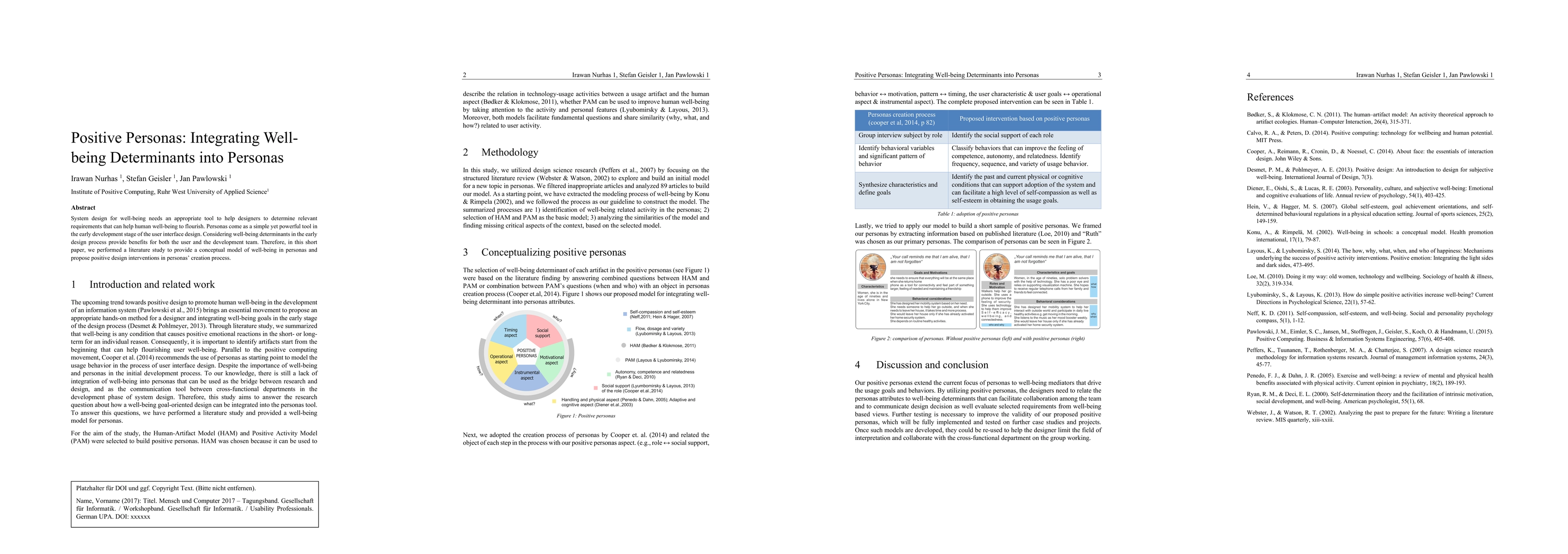 This paper presents a conceptual model integrating well-being determinants into personas, a design tool for early UI development stages. It proposes positive design interventions to benefit both users and developers in promoting human well-being.