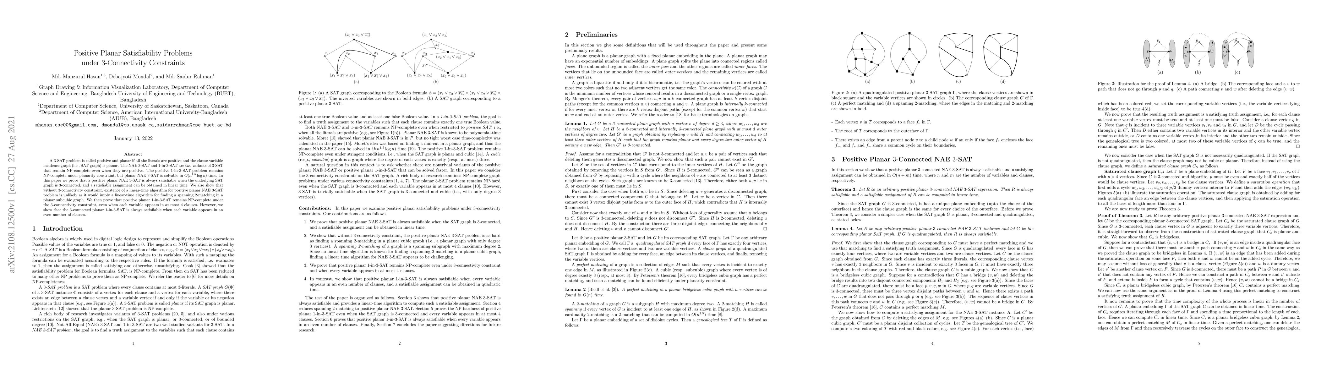 This paper investigates positive planar NAE 3-SAT problems under 3-connectivity constraints, proving that a 3-connected positive planar NAE 3-SAT is always satisfiable and can be solved in linear time. It also demonstrates that without the 3-connectivity constraint, a linear-time algorithm for this problem is unlikely. Additionally, it shows that positive planar 1-in-3-SAT remains NP-complete under 3-connectivity, but is always satisfiable when each variable appears in an even number of clauses.