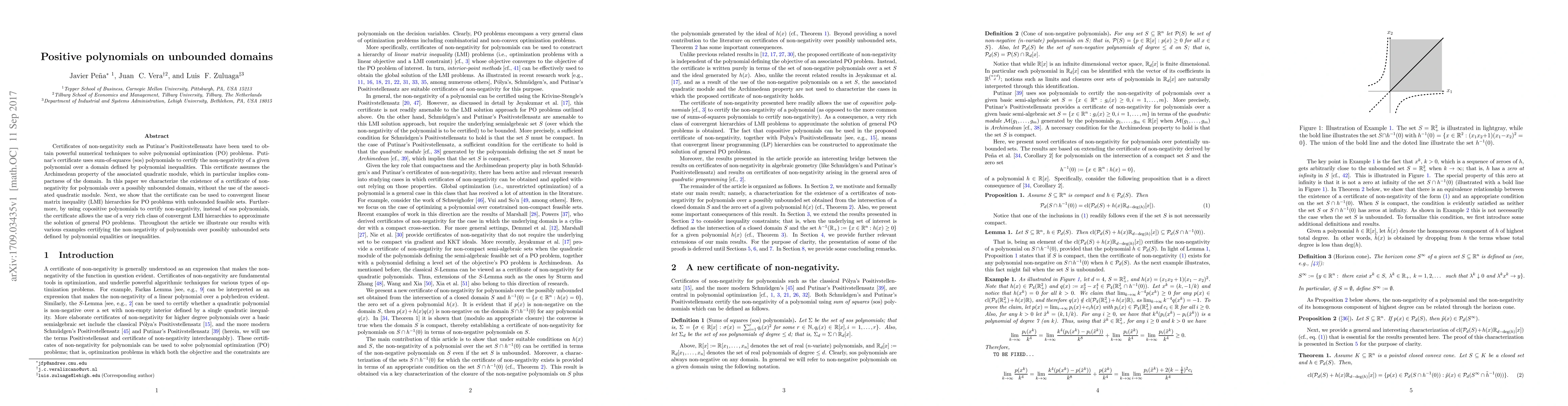 This paper develops a certificate for non-negativity on possibly unbounded domains without assuming compactness, enabling convergent LMI hierarchies for polynomial optimization problems.