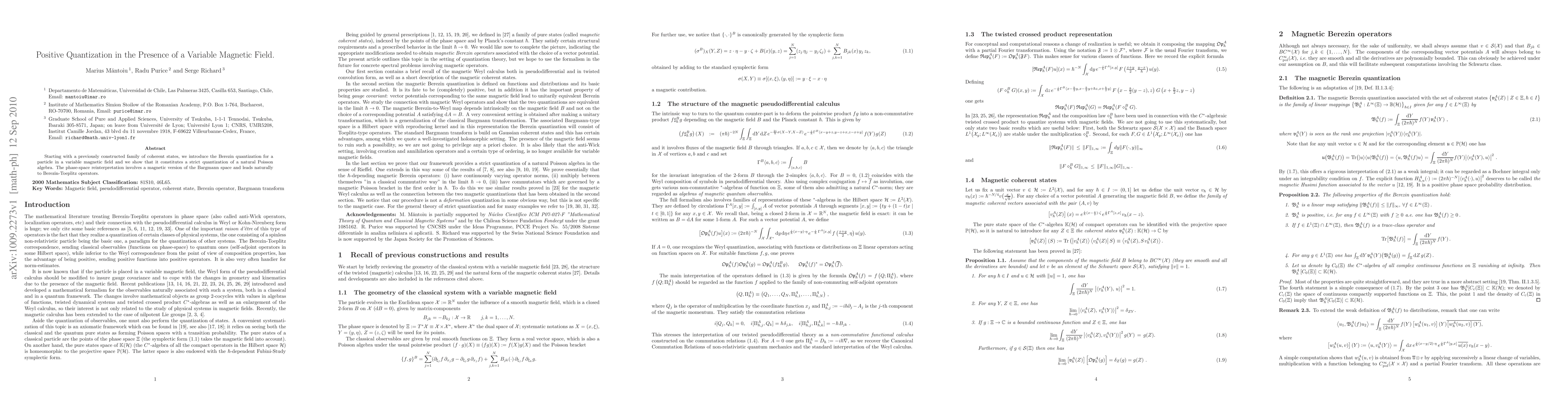 This paper introduces Berezin quantization for a particle in a variable magnetic field, demonstrating its strict quantization of a natural Poisson algebra, and utilizes a magnetic version of the Bargmann space to derive Berezin-Toeplitz operators.