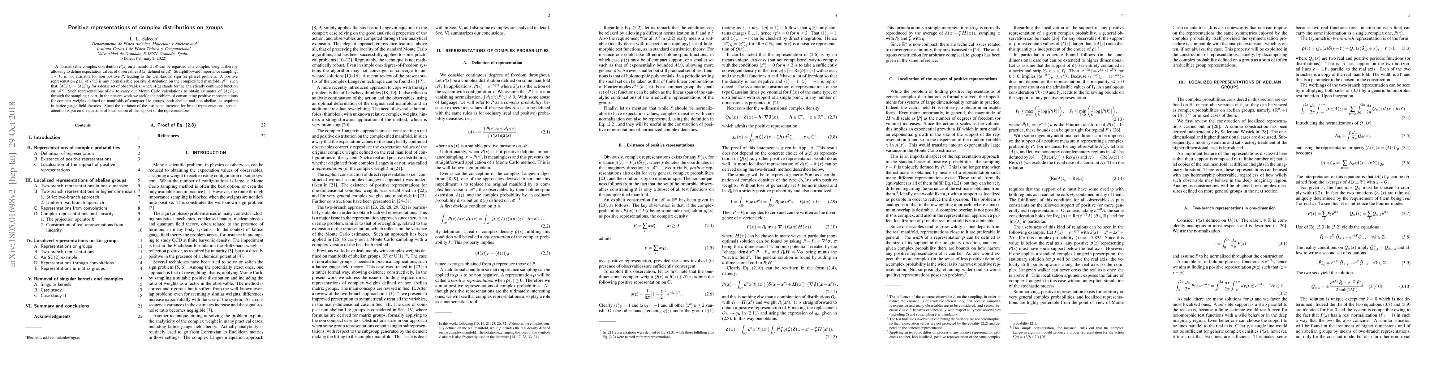 A normalizable complex distribution $P(x)$ on a manifold $\mathcal{M}$ can be regarded as a complex weight, thereby allowing to define expectation values of observables $A(x)$ defined on $\mathcal{M}$. Straightforward importance sampling, $x\sim P$, is not available for non positive $P$, leading to the well-known sign (or phase) problem. A positive representation $\rho(z)$ of $P(x)$ is any normalizable positive distribution on the complexified manifold $\mathcal{M}^c$, such that, $\langle A(x)\rangle_P = \langle A(z) \rangle_\rho$ for a dense set of observables, where $A(z)$ stands for the analytically continued function on $\mathcal{M}^c$. Such representations allow to carry out Monte Carlo calculations to obtain estimates of $\langle A(x) \rangle_P$, through the sampling $z \sim \rho$. In the present work we tackle the problem of constructing positive representations for complex weights defined on manifolds of compact Lie groups, both Abelian and non Abelian, as required in lattice gauge field theories. Since the variance of the estimates increase for broad representations, special attention is put on the question of localization of the support of the representations.
