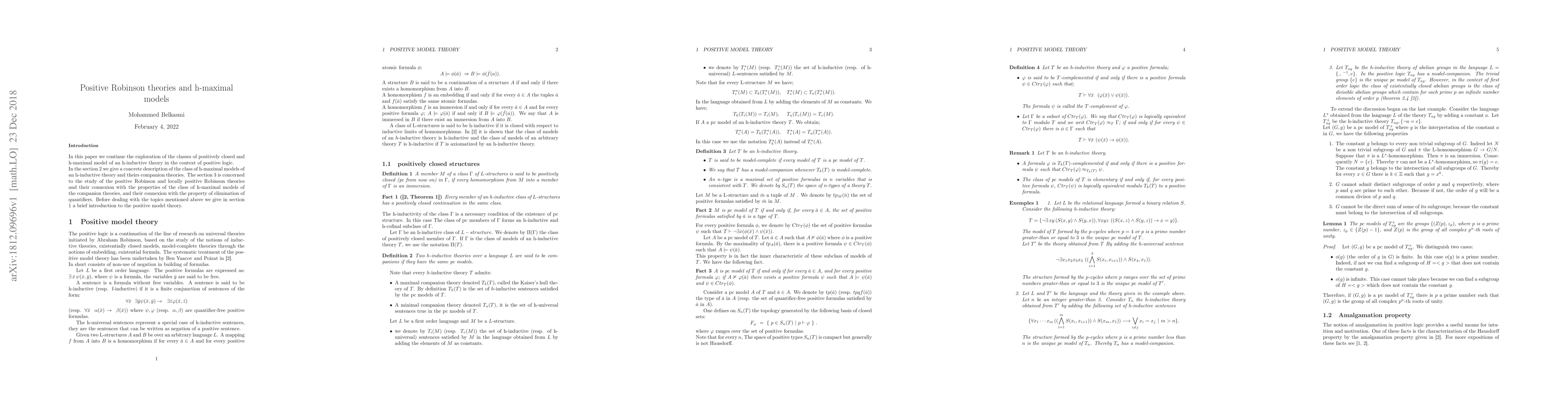 This paper explores h-maximal models of h-inductive theories in positive logic, detailing their companion theories. It further investigates positive Robinson theories and their connection to the properties of h-maximal models, focusing on quantifier elimination.