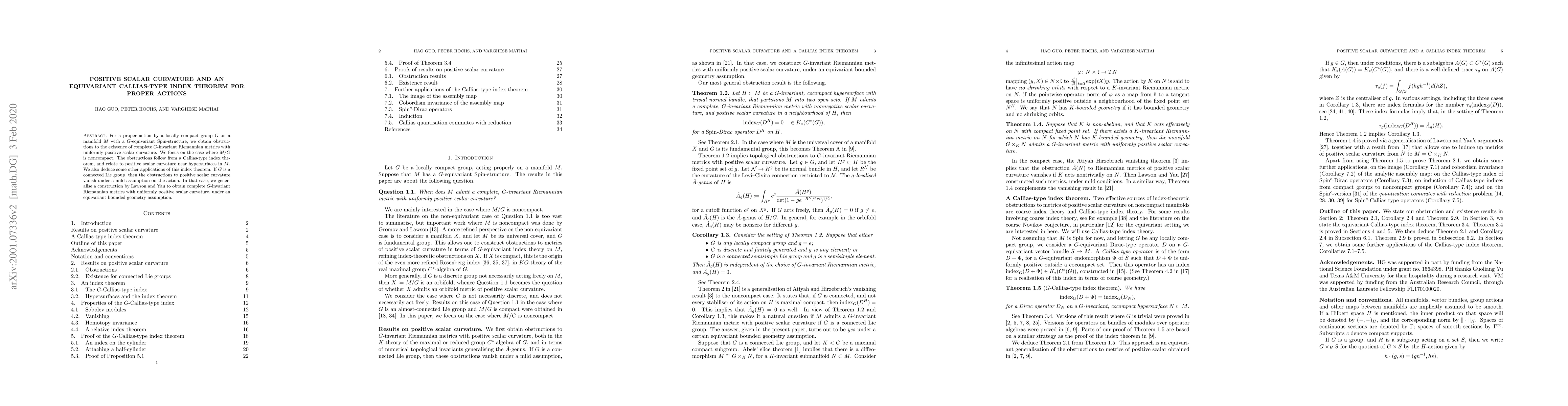 For a proper action by a locally compact group $G$ on a manifold $M$ with a $G$-equivariant Spin-structure, we obtain obstructions to the existence of complete $G$-invariant Riemannian metrics with uniformly positive scalar curvature. We focus on the case where $M/G$ is noncompact. The obstructions follow from a Callias-type index theorem, and relate to positive scalar curvature near hypersurfaces in $M$. We also deduce some other applications of this index theorem. If $G$ is a connected Lie group, then the obstructions to positive scalar curvature vanish under a mild assumption on the action. In that case, we generalise a construction by Lawson and Yau to obtain complete $G$-invariant Riemannian metrics with uniformly positive scalar curvature, under an equivariant bounded geometry assumption.