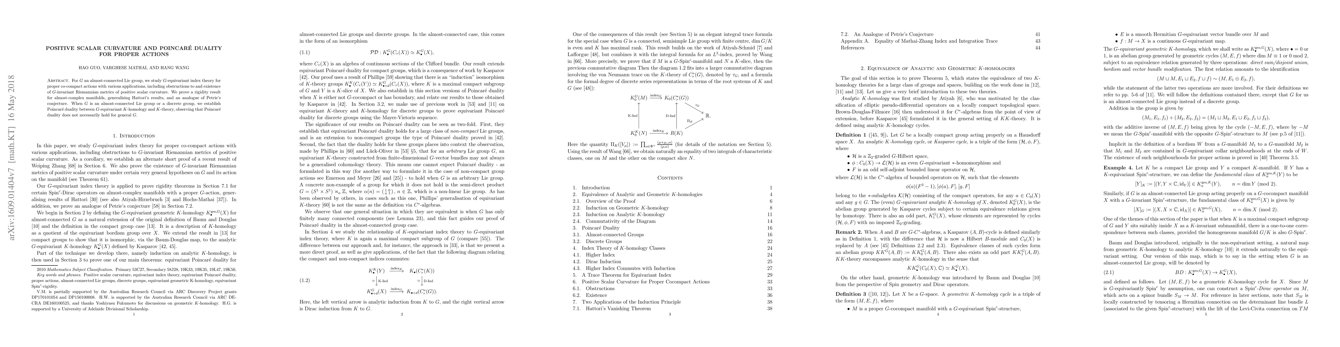 For G an almost-connected Lie group, we study G-equivariant index theory for proper co-compact actions with various applications, including obstructions to and existence of G-invariant Riemannian metrics of positive scalar curvature. We prove a rigidity result for almost-complex manifolds, generalising Hattori's results, and an analogue of Petrie's conjecture. When G is an almost-connected Lie group or a discrete group, we establish Poincare duality between G-equivariant K-homology and K-theory, observing that Poincare duality does not necessarily hold for general G.