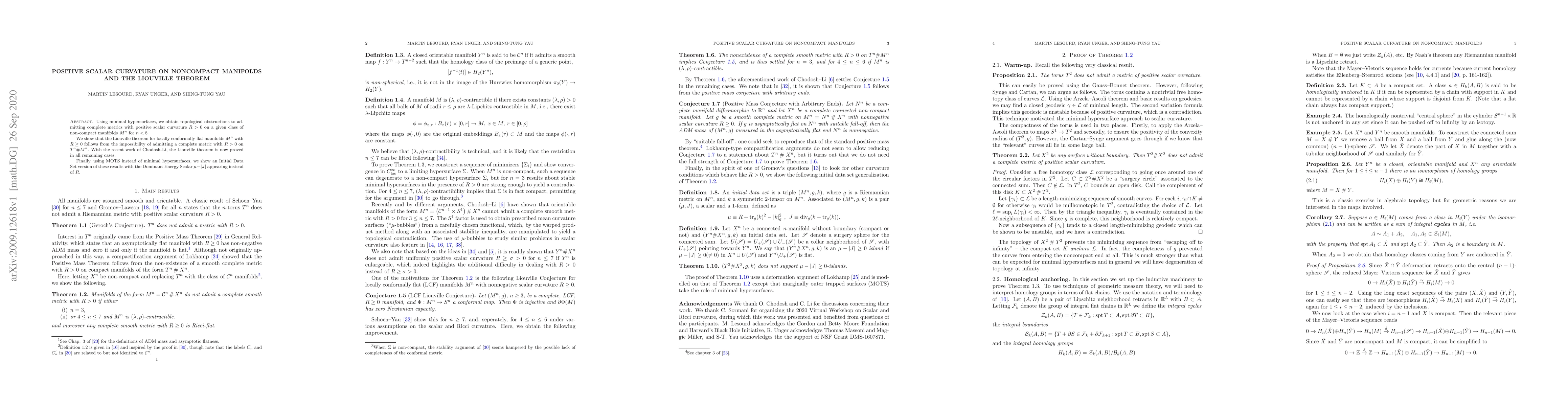 Using minimal hypersurfaces, we obtain topological obstructions to admitting complete metrics with positive scalar curvature on a given class of non-compact n-manifolds with n less than 8. We show that the Liouville theorem for a locally conformally flat n-manifold of non-negative scalar curvature follows from the impossibility of there being a positive scalar curvature metric on its connect sum with the n-torus. With the recent work of Chodosh-Li, the Liouville theorem is now proved in all remaining cases. Finally, using MOTS instead of minimal hypersurfaces, we show an Initial Data Set version of these results with the Dominant Energy Scalar appearing instead of positive scalar curvature.
