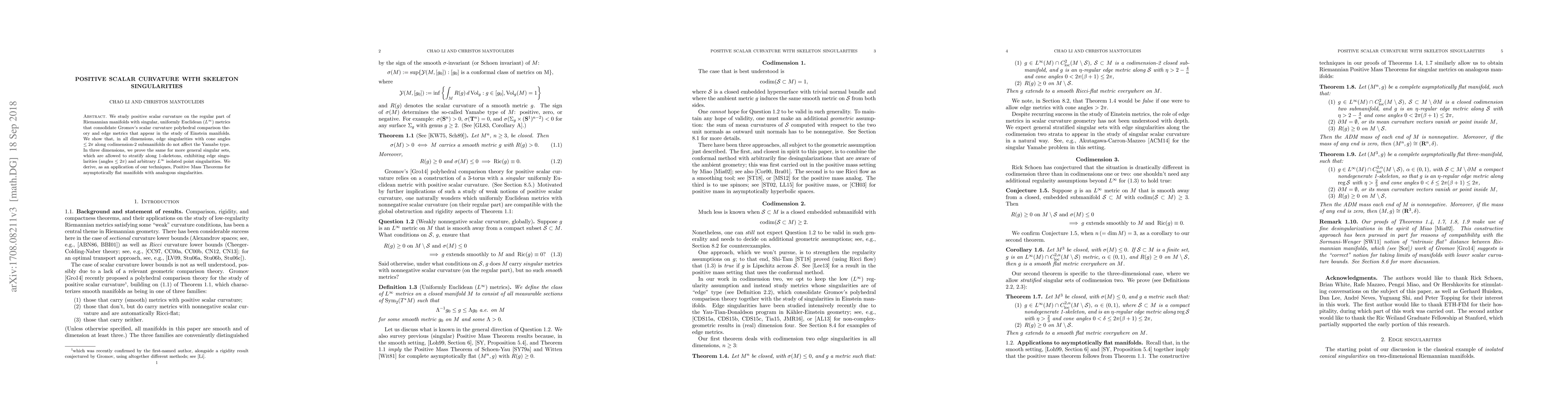 This paper investigates positive scalar curvature on Riemannian manifolds with skeleton singularities, proving that certain types of singularities do not affect scalar curvature properties. In three dimensions, it extends this result to more general singular sets, leading to Positive Mass Theorems for asymptotically flat manifolds with similar singularities.